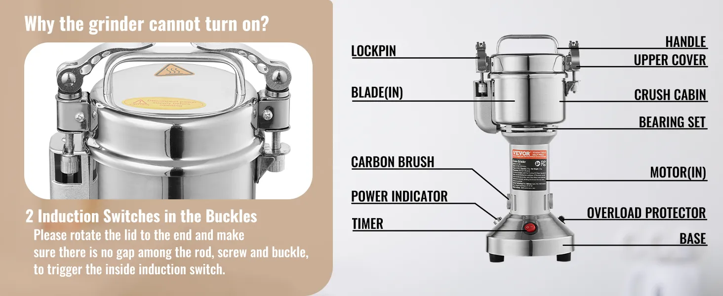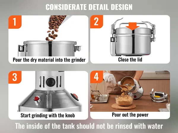 Gebruiksaanwijzing: 1. Deze commerciële koffiemolen mag alleen worden ingeschakeld als het deksel volledig gesloten is. 2. Het grondmateriaal moet voldoende droog zijn. 3. Laat de machine na elke 5 minuten gebruik 5 tot 10 minuten rusten. 4. Zorg ervoor dat de maling het lange mes bedekt en niet meer dan 2/3 van de container. 5. Maak de maalbeker niet rechtstreeks met water schoon. Gebruik in plaats daarvan een droge doek of borstel.