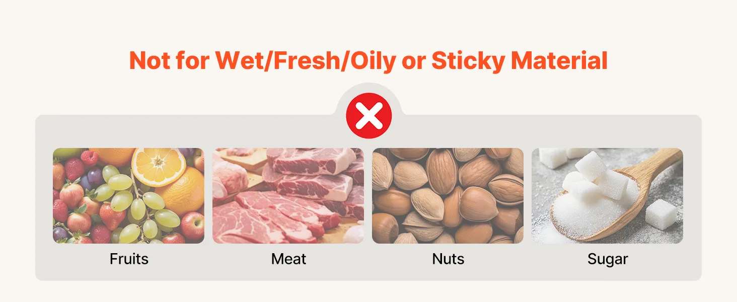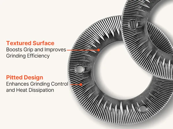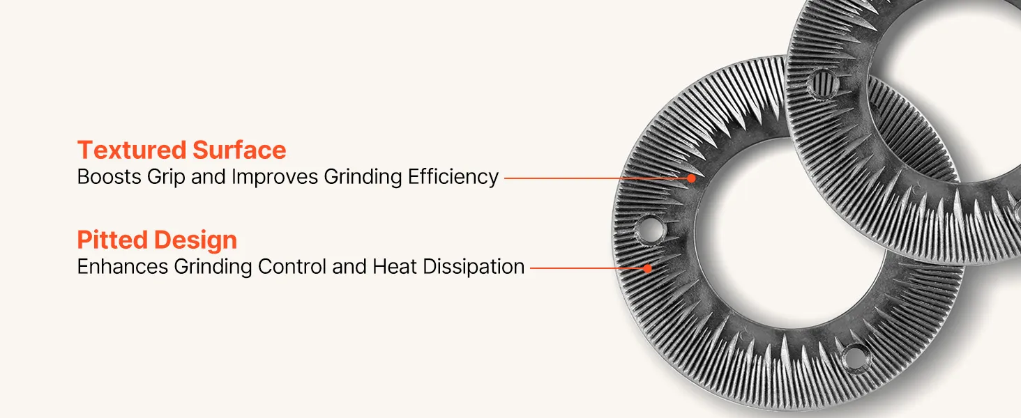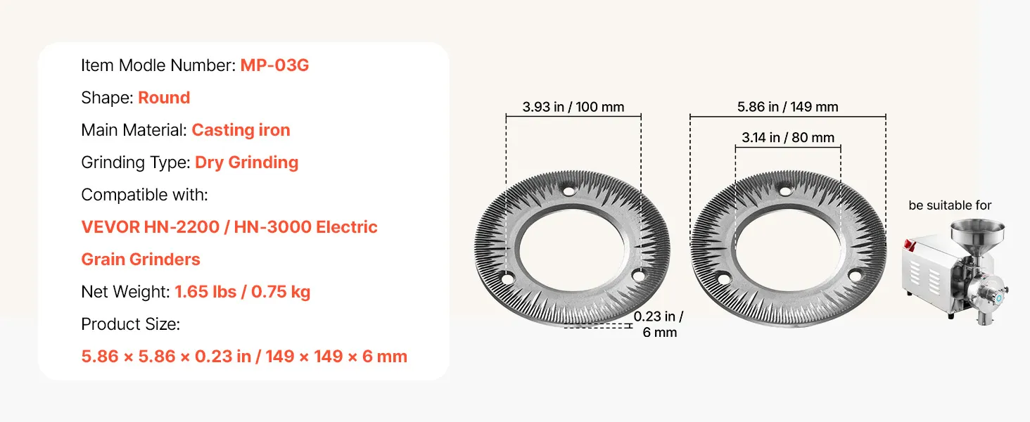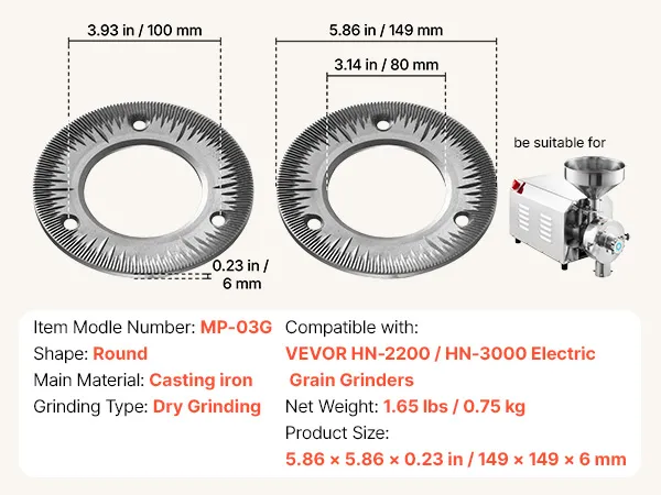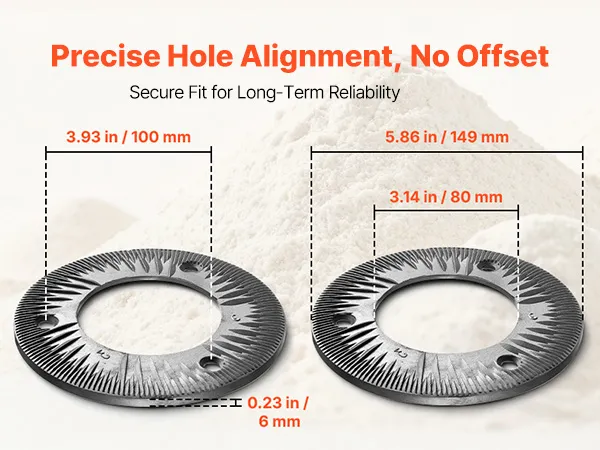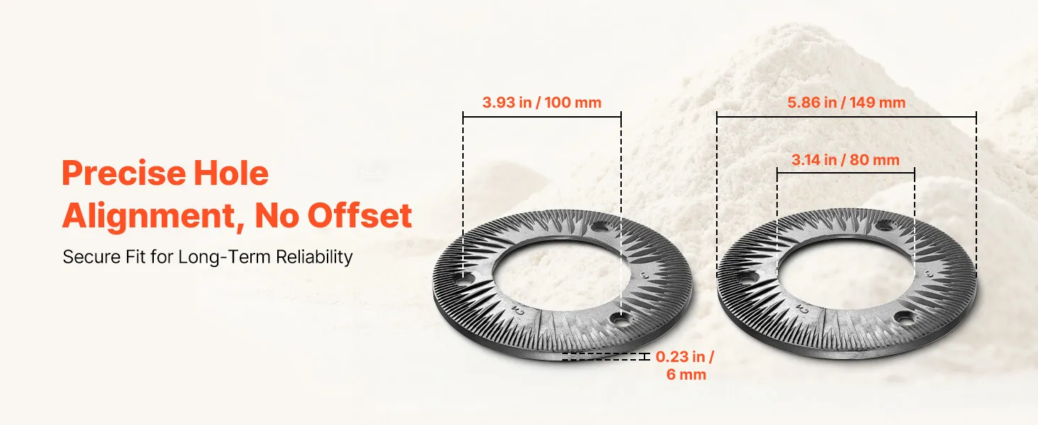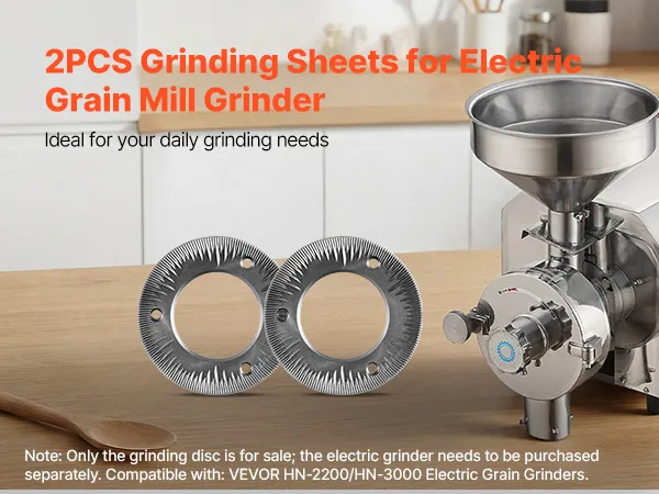 Veelzijdig droog malen: De VEVOR 2-delige set maalschijven voor elektrische graanmolens is ideaal voor het droog malen van granen, tarwe, maïs, koffiebonen en specerijen zoals peper, kaneel en venkel. Harde ingrediënten moeten vooraf worden fijngemalen. Niet geschikt voor het verwerken van vochtige, verse, olieachtige of kleverige materialen.