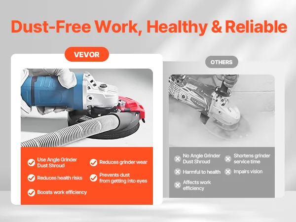 The dust extraction shroud captures up to 95% of airborne dust, preventing dirt splashes. It not only reduces health risks but also improves work efficiency by minimizing dust-related wear on your angle grinder, allowing you to enjoy a cleaner, healthier environment.