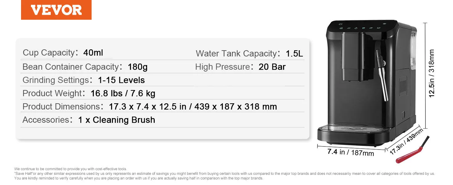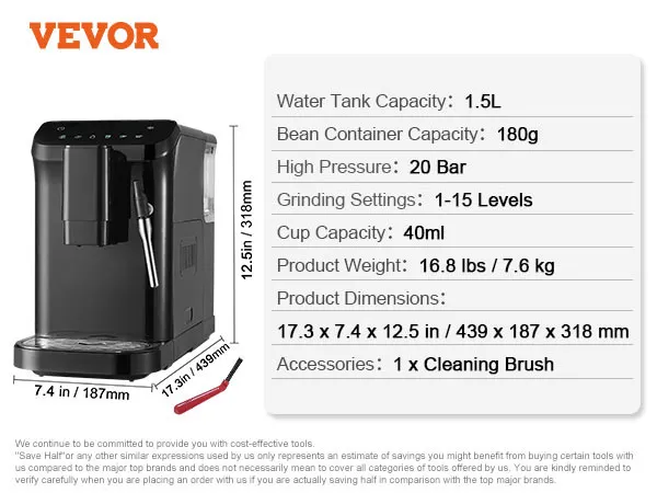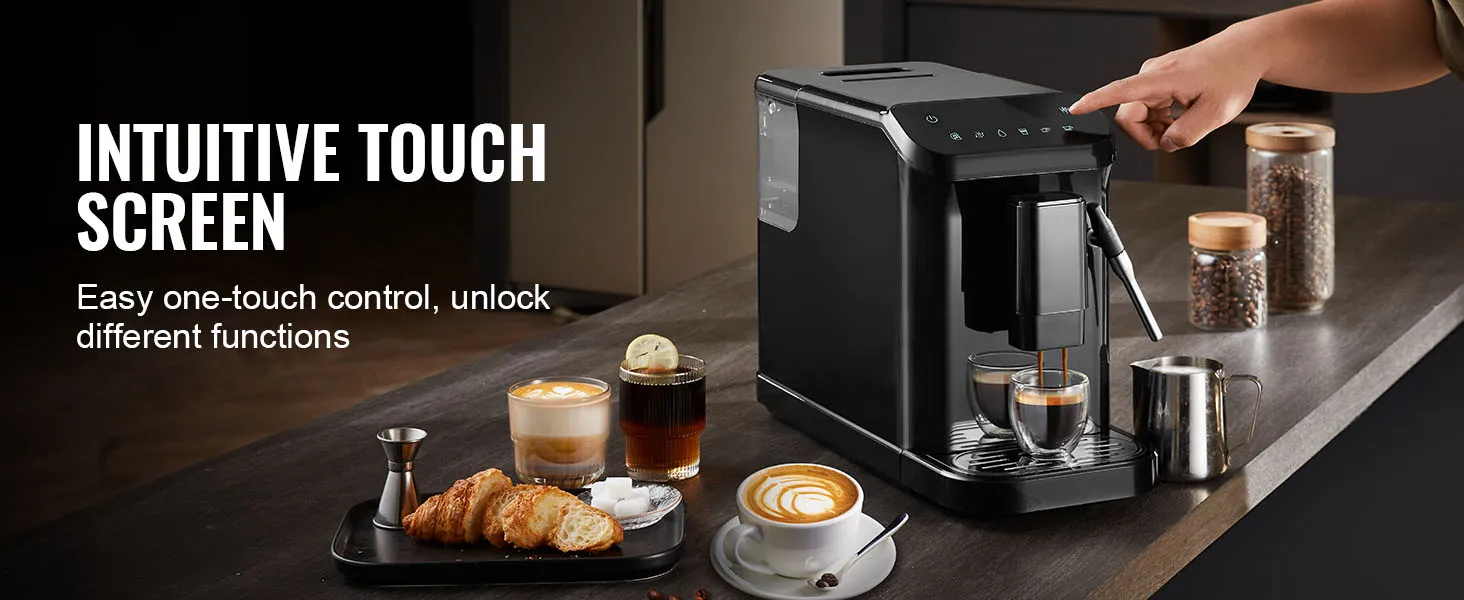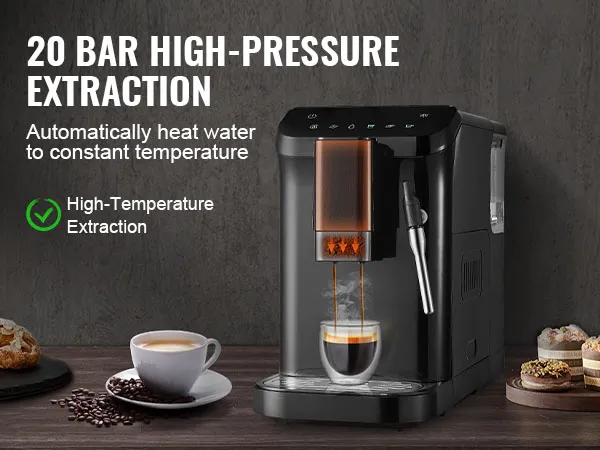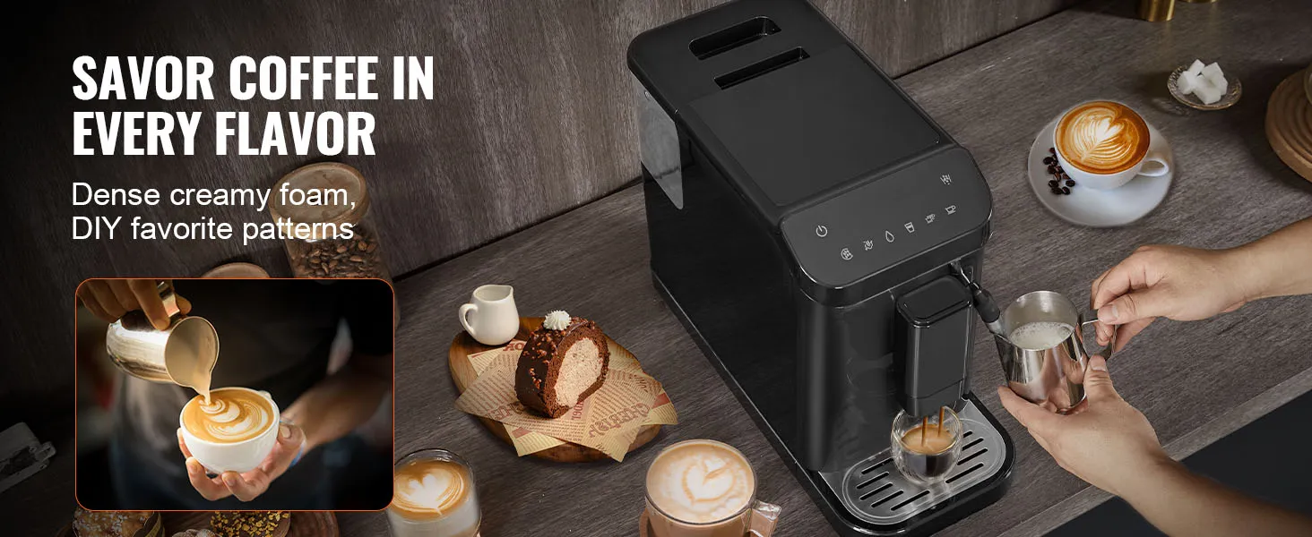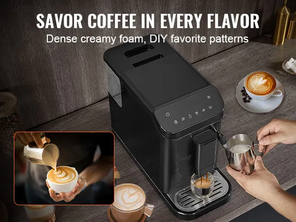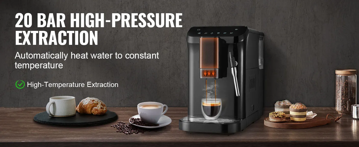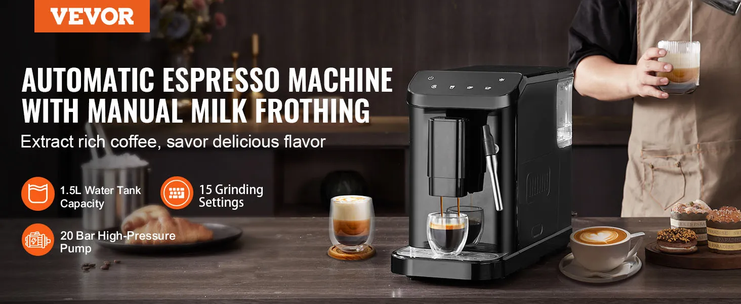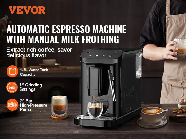 VEVOR automatic espresso machine is a perfect blend of convenience and quality. With its built-in grinder, 15-level adjustable grinding settings, 20-bar pressure system, and powerful milk frother wand, you can effortlessly create a rich, aromatic espresso tailored to your taste.