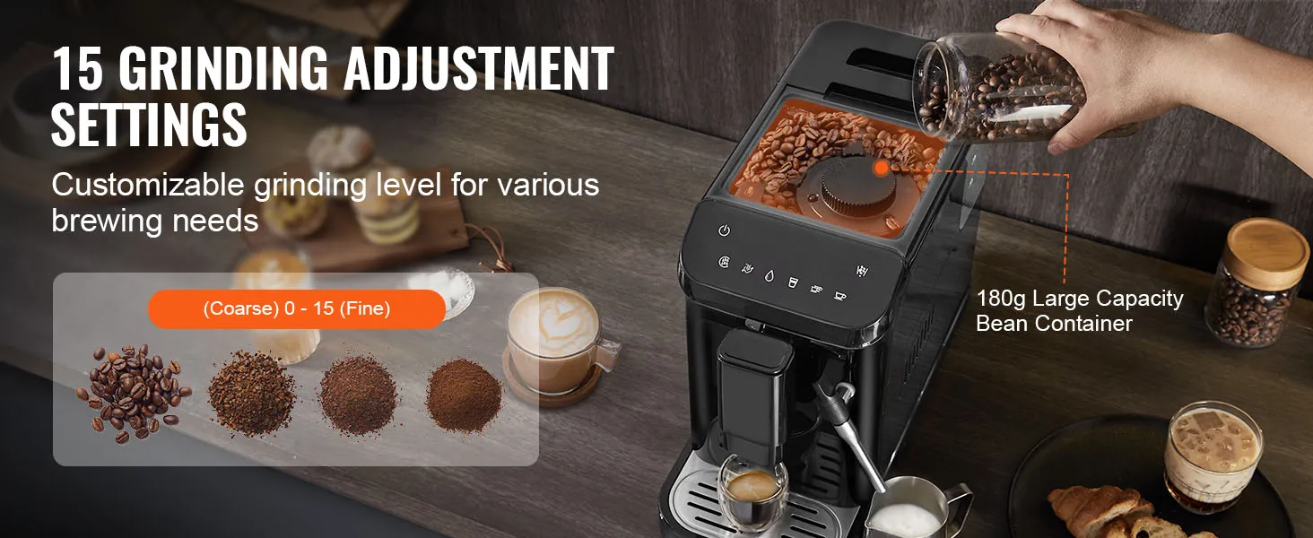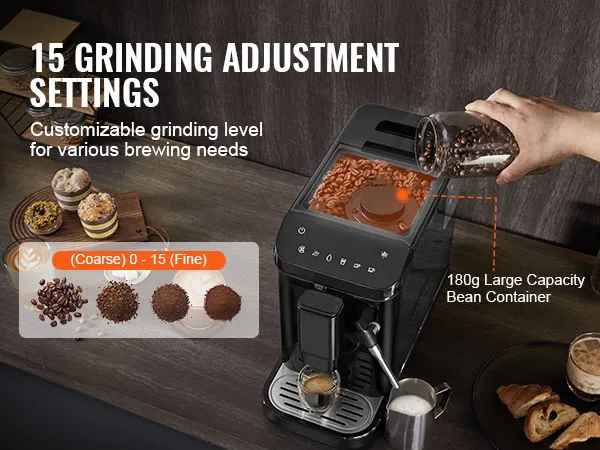 Built-in Grinder & Adjustable Grinding: VEVOR automatic espresso machine features a built-in grinder and a spacious 180g bean hopper, allowing you to transform your beans into espresso in just seconds. With 15 grinding settings to choose from, customizing your coffee to match your taste preferences is effortless.