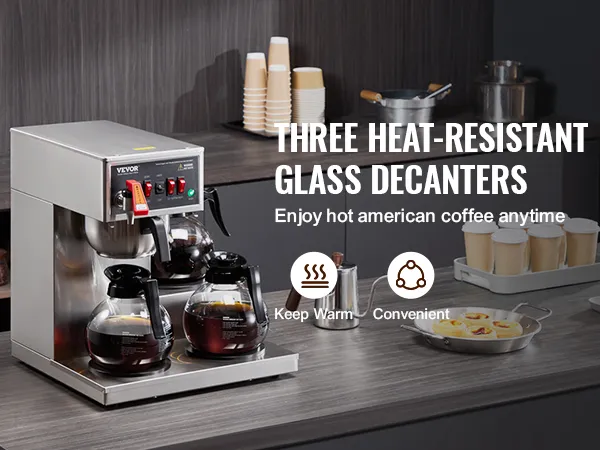 Equipped with dual warming plates, this commercial coffee machine keeps 3 glass carafes warm during operation, ensuring you have hot coffee available anytime.
