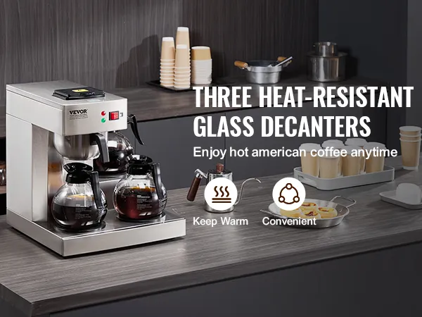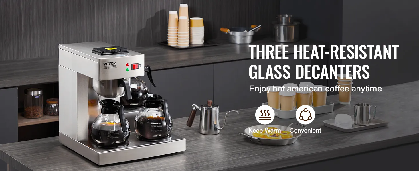 Langdurig warmhouden: deze commerciële koffiemachine is uitgerust met 3 warmhoudplaten en 3 glazen karaffen, uw kant-en-klare warme koffie staat altijd klaar om te serveren.