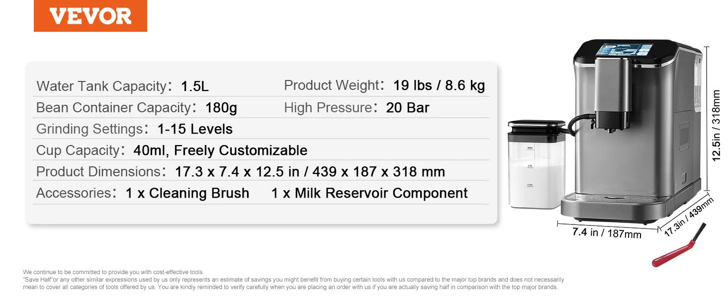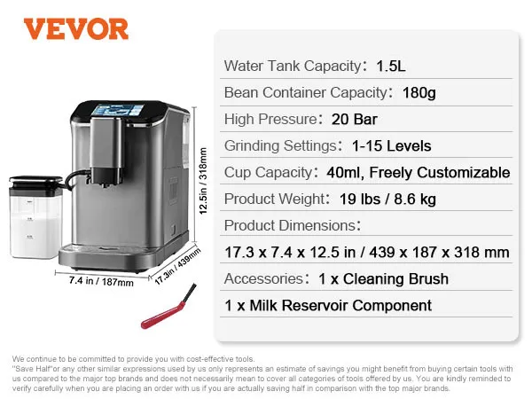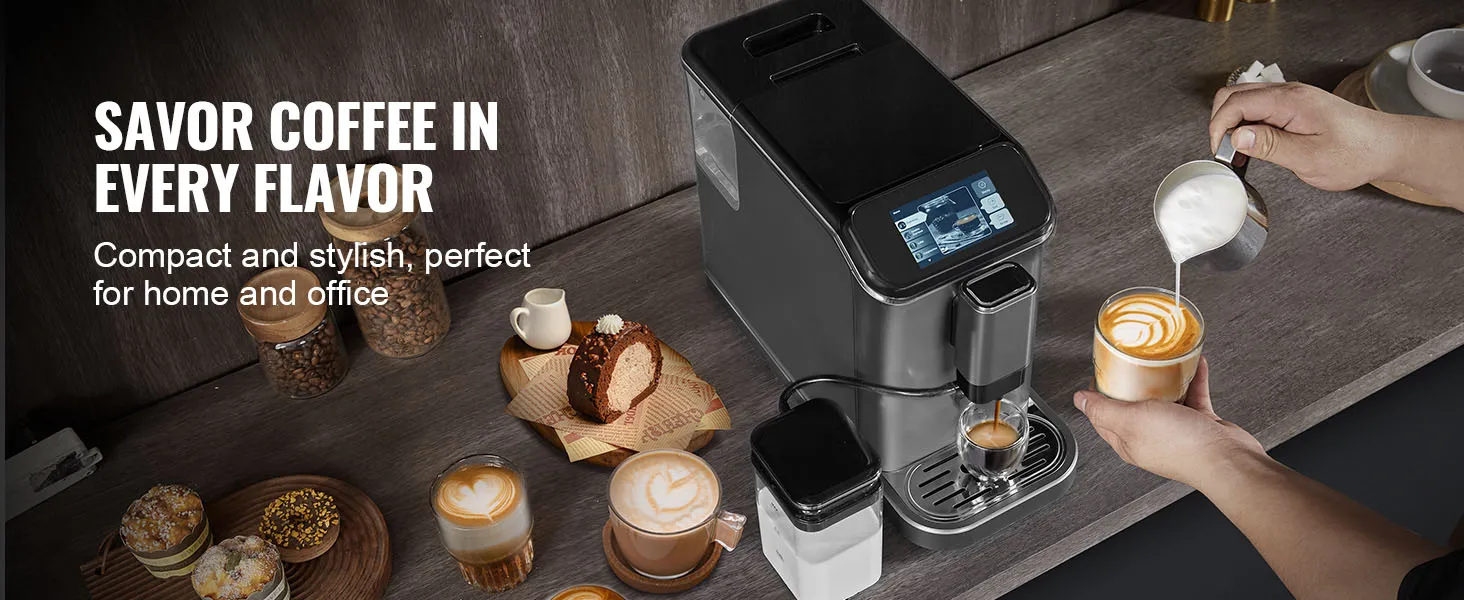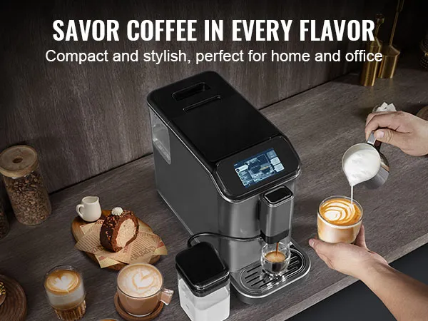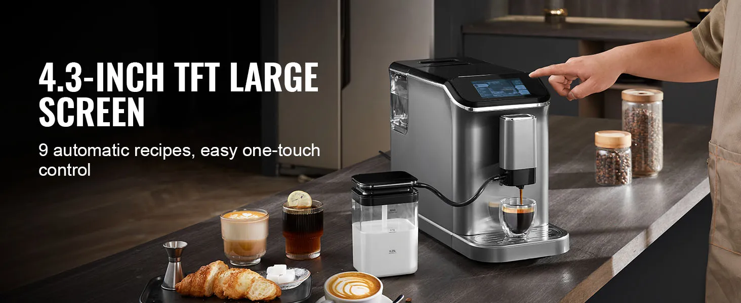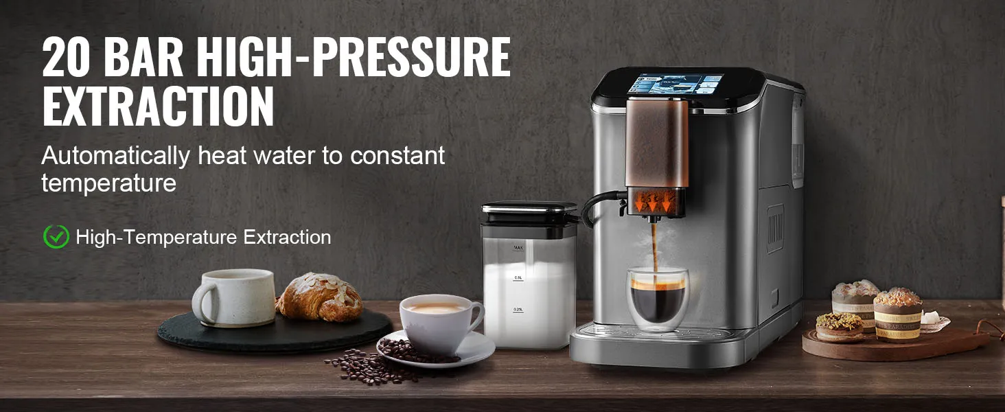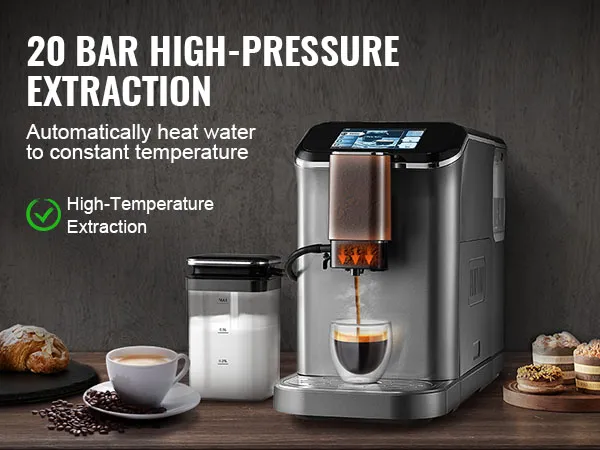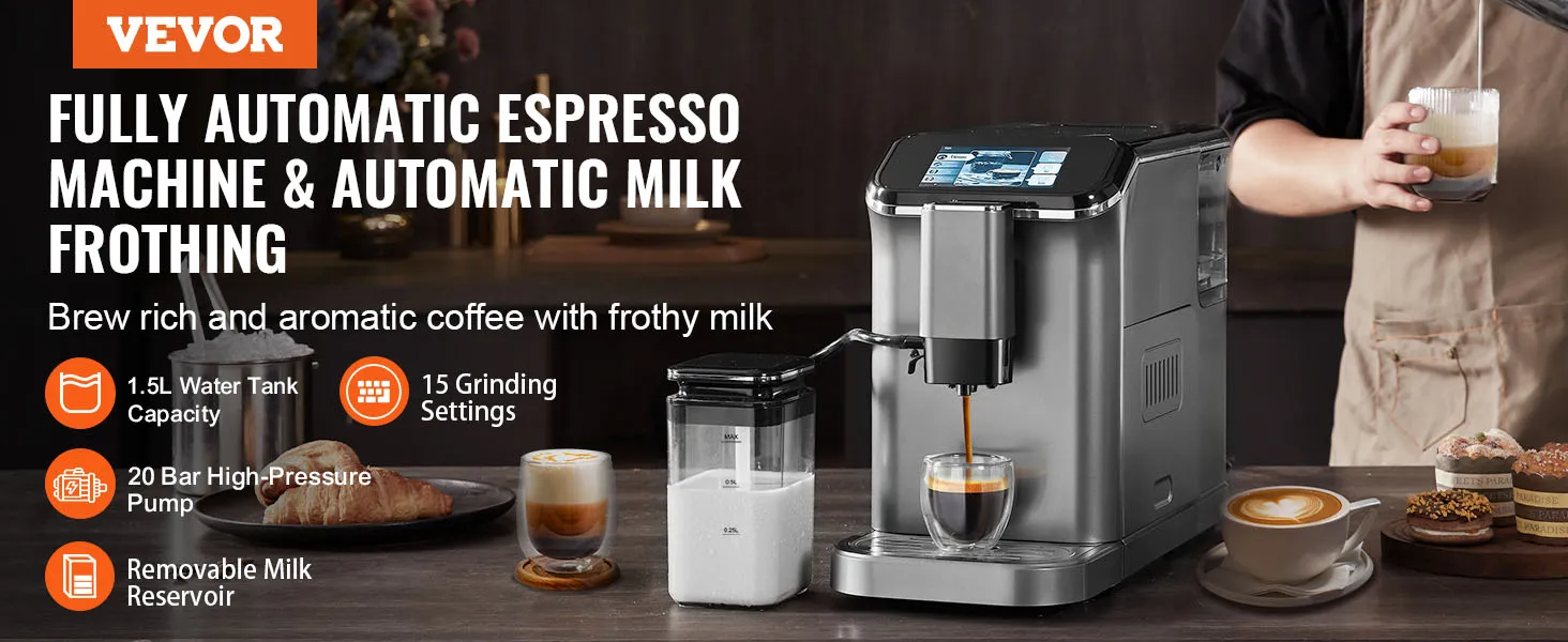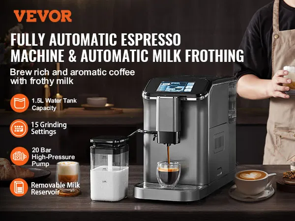 VEVOR fully automatic espresso machine - your ultimate home coffee solution. It combines convenience and quality, featuring automatic milk frothing system, built-in grinder with 15 adjustable settings, and 20-bar high-pressure extraction, letting you enjoy barista-quality coffee with ease.