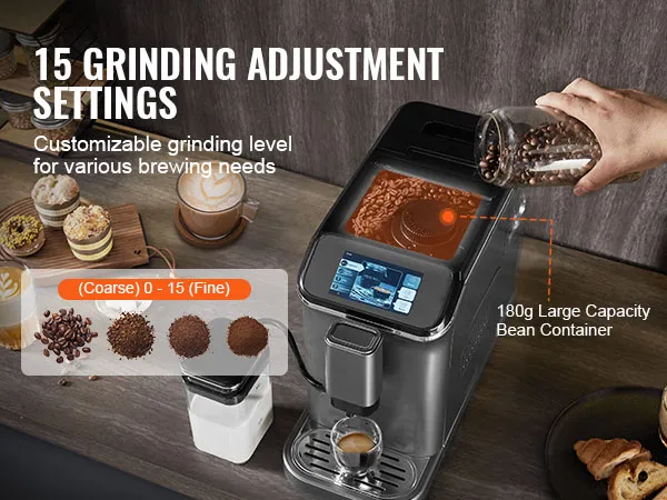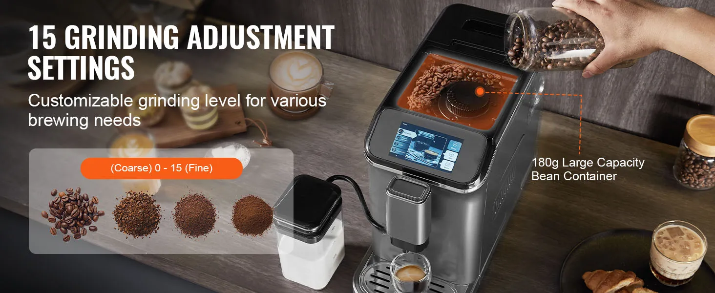 Built-in Grinder & Adjustable Grinding: VEVOR automatic espresso machine features a built-in grinder and a spacious 180g bean hopper, allowing you to transform your beans into espresso in just seconds. With 15 grinding settings to choose from, customizing your coffee to match your taste preferences is effortless.