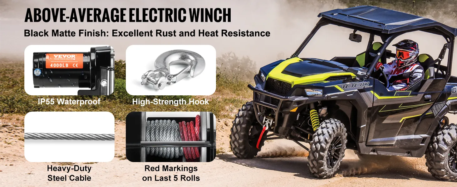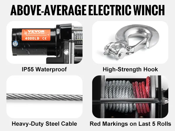 Zorgeloos trekvermogen: barre weersomstandigheden? Geen probleem! Onze elektrische lier is IP55 waterdicht en heeft een gladde, matzwarte afwerking die de roestbestendigheid en isolatie verbetert. Hij is klaar voor zware regen, modder of andere zware omstandigheden. Kleurgecodeerde stroomkabels en eenvoudig te volgen instructies zorgen voor een soepele installatie, zodat u weer kunt genieten van uw rit.