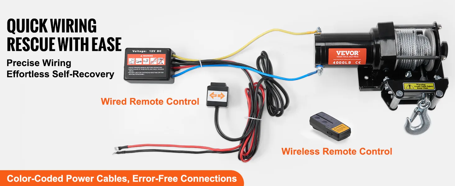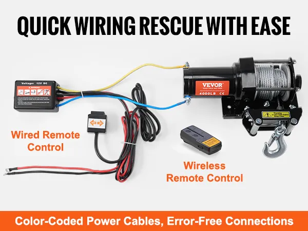 Geen verwarde kabels meer! Onze 12-volt lier is voorzien van kleurgecodeerde stroomkabels voor een snelle, foutloze installatie. Met de bedrade afstandsbediening sluit u eenvoudigweg de stroomkabels aan en bent u klaar voor een soepele, efficiënte voertuigherstel.