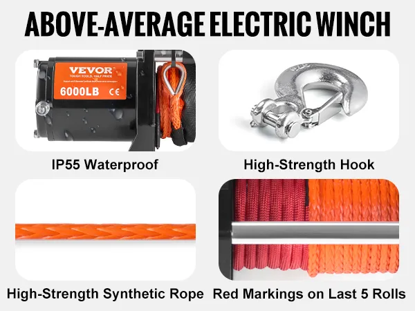 Our heavy-duty truck winch features a 6000 lbs line pull capacity and an IP55 waterproof rating, perfect for freeing your off-road vehicles or SUV from sticky mud pits. With a 12V DC/2.5 HP permanent magnet copper motor, 195.8:1 gear ratio, and synthetic rope, you're always prepared.