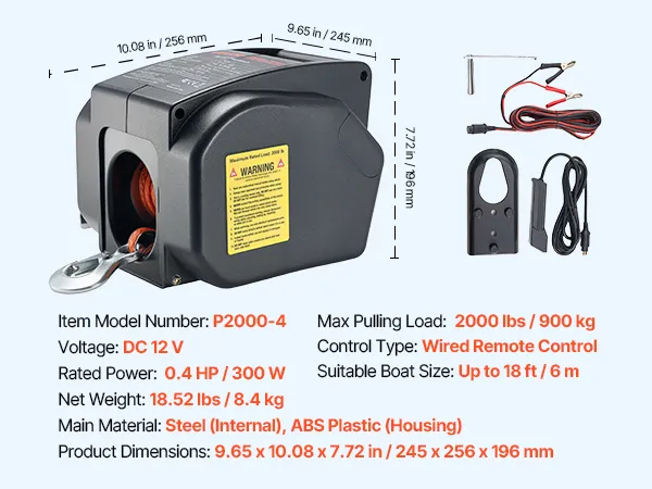 Duurzaam touw: We rusten de elektrische scheepslier uit met een 0,2 inch polyethyleen touw, dat robuust maar toch licht is. Met een lengte van 9 meter en een treksterkte van 2030 kg kan hij moeiteloos zware sleeptaken aan.