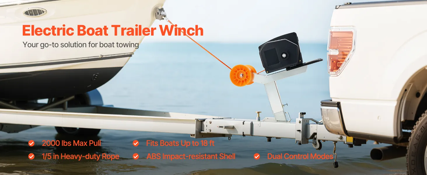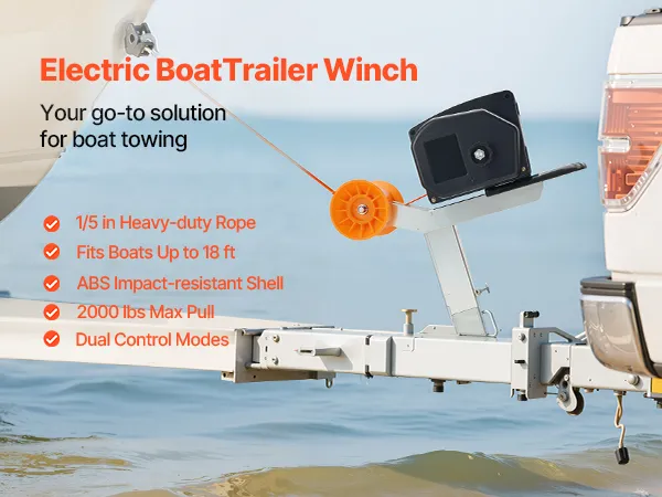 Krachtige trekkracht: onze elektrische bootlier met koperen motor van 0,4 pk (12 V) levert een trekkracht tot 900 kg. U kunt boten tot 5,5 meter trekken met soepele, betrouwbare kracht, voor moeiteloos laden en te water laten van trailers.