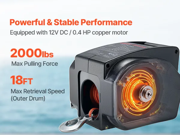 De 12V DC-motor met 0,4 pk van de omkeerbare elektrische lier biedt een krachtige trekkracht met een maximaal hefvermogen van 2000 lbs. Hij werkt met snelheden tot 2,4 m/min, wat zorgt voor soepel en stabiel slepen, zelfs onder zware omstandigheden.