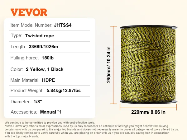 VEVOR Elektrisch hekdraad, 1026 m draagbaar polydraad, diameter 3/8 inch, 6 roestvrijstalen strengen voor betrouwbare geleiding en UV- en roestbestendigheid, hekdraad voor paarden, vee en vee