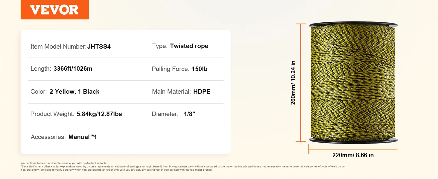 Hoge treksterkte: de schrikdraad heeft een diameter van 1/8 inch / 0,32 cm en wordt geleverd op een rollengte van 3366 voet / 1026 m. Het is bestand tegen een spanning tot 68 kg. Of het nu gaat om het omheinen van vee of het voorkomen dat wilde dieren binnendringen, de hoge treksterkte zorgt voor stabiliteit en veiligheid, waardoor het perfect is voor tijdelijke weilanden en roterende weilanden.