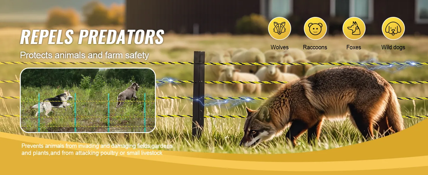 Hoge geleidbaarheid: De goed zichtbare draadafrastering is gemaakt van goed geleidend roestvrij staaldraad. Wanneer dieren in contact komen met het hek, ontvangen ze een korte en ongevaarlijke elektriciteitspuls die een geconditioneerde reflex activeert die verder contact verhindert. Dit voorkomt dat wilde dieren velden, boomgaarden, weilanden en tuinen betreden en helpt uw vee te beschermen en de veiligheid van uw boerderij en tuin te behouden.