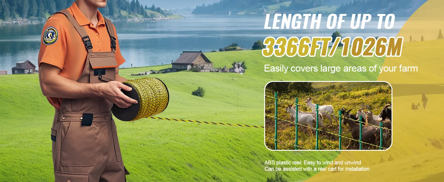 Met een lengte tot 1026 m dekt dit elektrische veehek gemakkelijk grote oppervlakken van uw bedrijf af. Met de meegeleverde ABS-kunststof roller kunt u de draad gemakkelijk op- en afwikkelen, en u kunt een rollenwagen gebruiken om te helpen bij de installatie.