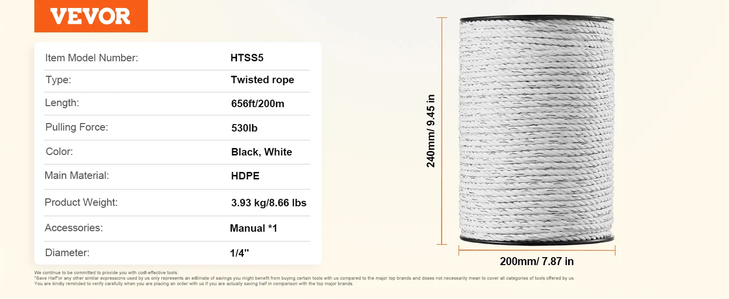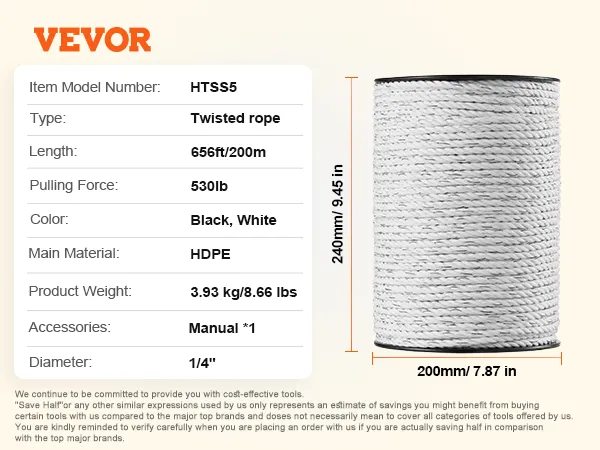 VEVOR Elektrisch hekdraad, 200 m draagbaar polydraad, 1/4 inch diameter, 6 roestvrijstalen strengen voor betrouwbare geleiding en UV- en roestbestendigheid, hekdraad voor paarden, vee en vee