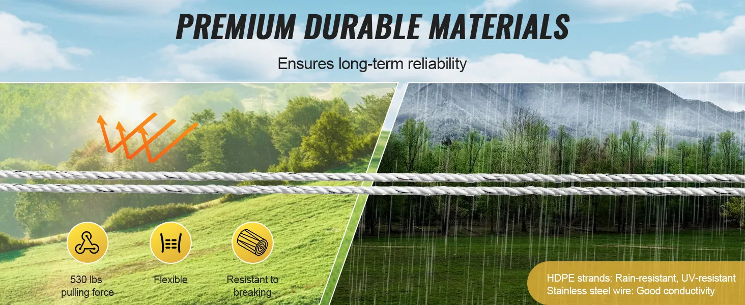 Duurzaam en slijtvast materiaal: de draagbare schrikdraad is gemaakt van geweven HDPE-vezels en 6 strengen roestvrij staaldraad, wat een hoge treksterkte en een lichtgewicht constructie biedt. Het is slijtvast en roestbestendig en garandeert langdurige betrouwbaarheid. Het is ook gemakkelijk te verwijderen en op te bergen, zodat er geen rommel achterblijft op de weide en het milieu wordt beschermd.