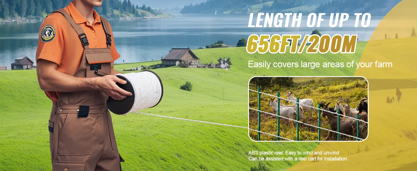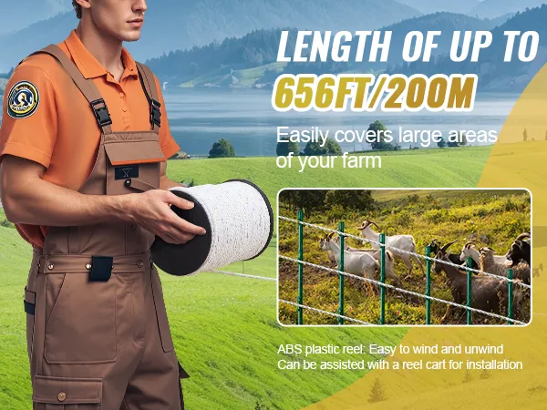 Met een lengte tot 200 m dekt dit elektrische veehek gemakkelijk grote oppervlakken van uw bedrijf af. Met de meegeleverde ABS-kunststof roller kunt u de draad gemakkelijk op- en afwikkelen, en u kunt een rollenwagen gebruiken om te helpen bij de installatie.