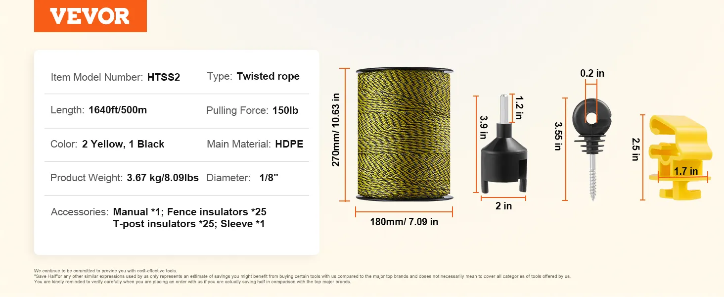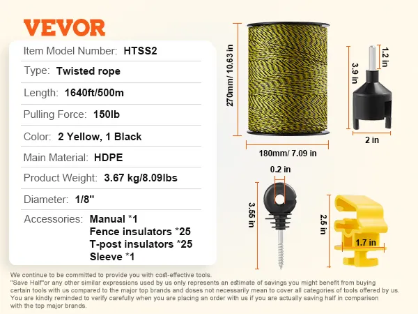 VEVOR elektrische omheiningsdraad, 500 m draagbare polydraad, 3 mm diameter, 6 roestvrijstalen strengen, omheiningskoord met 25 omheiningsisolatoren en 25 T-paalisolatoren, voor paarden, vee en vee