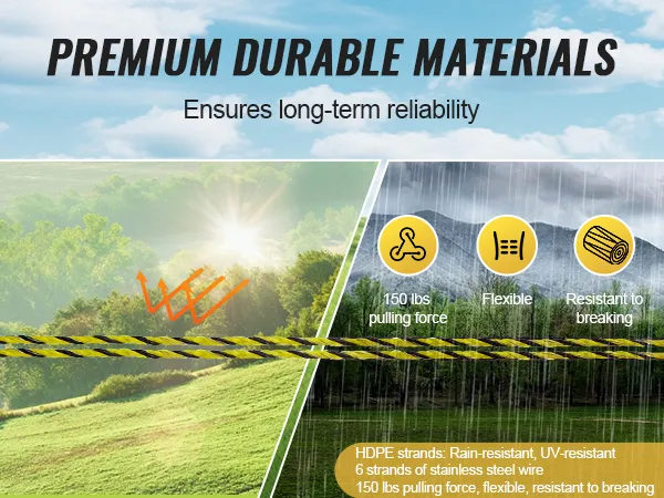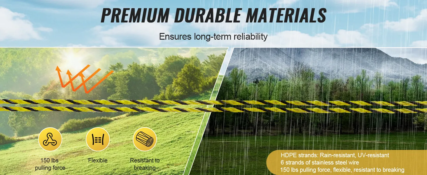 Duurzaam en slijtvast materiaal: deze draagbare schrikdraad is gemaakt van geweven HDPE-vezel en 6 strengen roestvrij staaldraad en is roest- en UV-bestendig. Dankzij de lange levensduur hoeft u hem niet vaak te vervangen of te onderhouden, waardoor u tijd en geld bespaart.