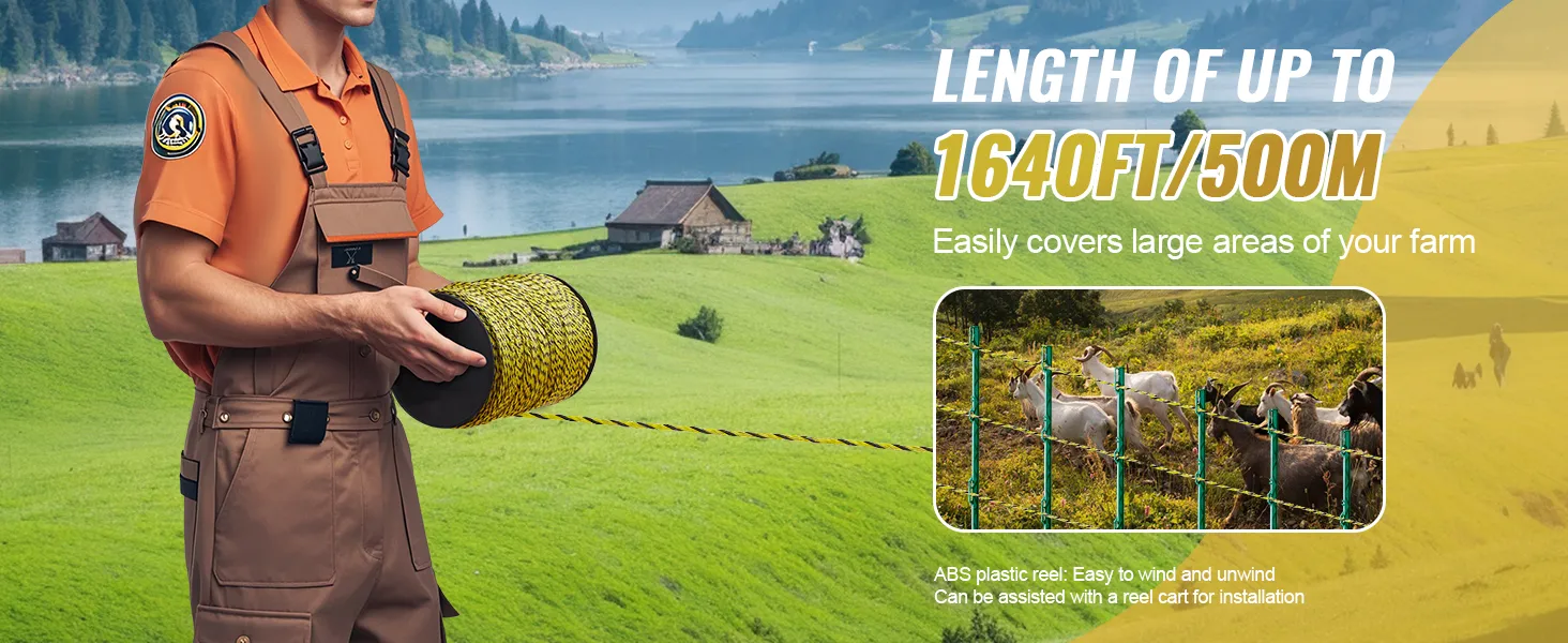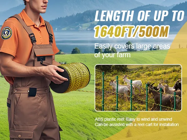 Met een lengte tot 500 m dekt dit elektrische veehek gemakkelijk grote oppervlakken van uw bedrijf af. Met de meegeleverde ABS-kunststof roller kunt u de draad gemakkelijk op- en afwikkelen, en u kunt een rollenwagen gebruiken om te helpen bij de installatie.