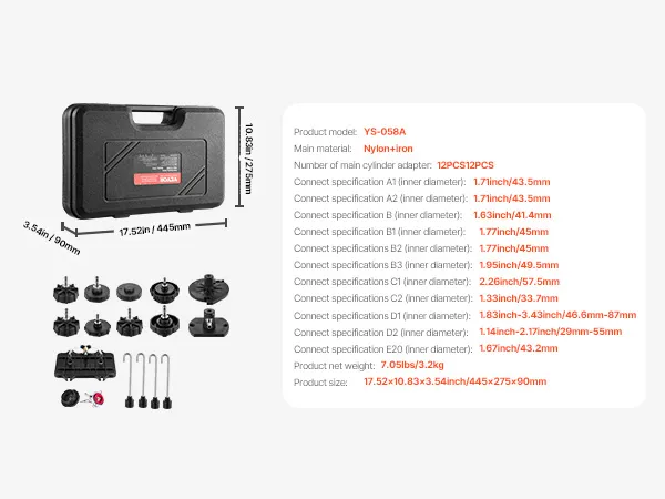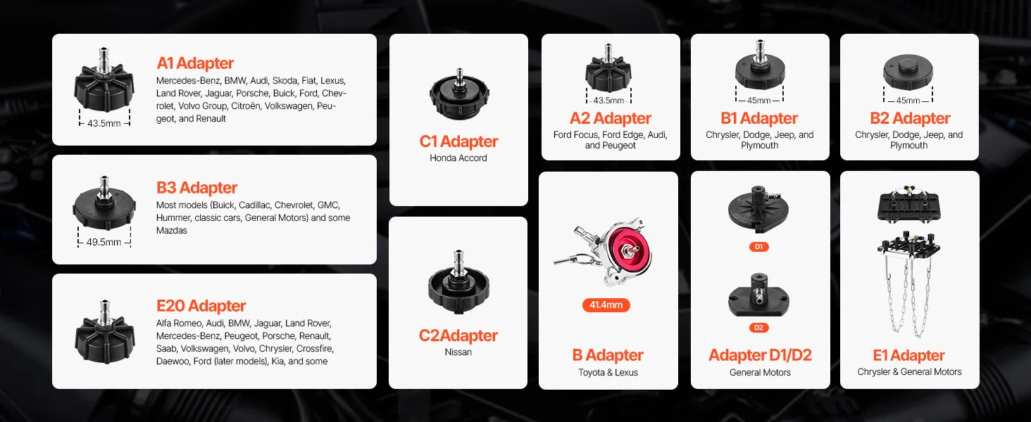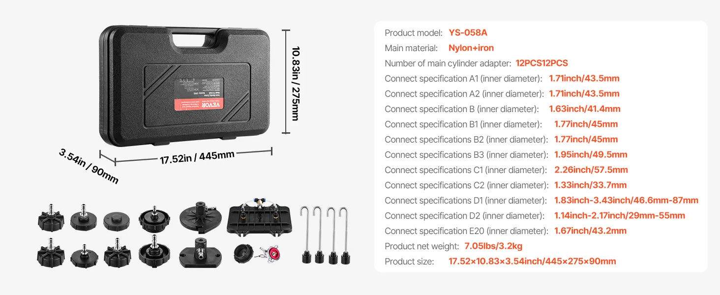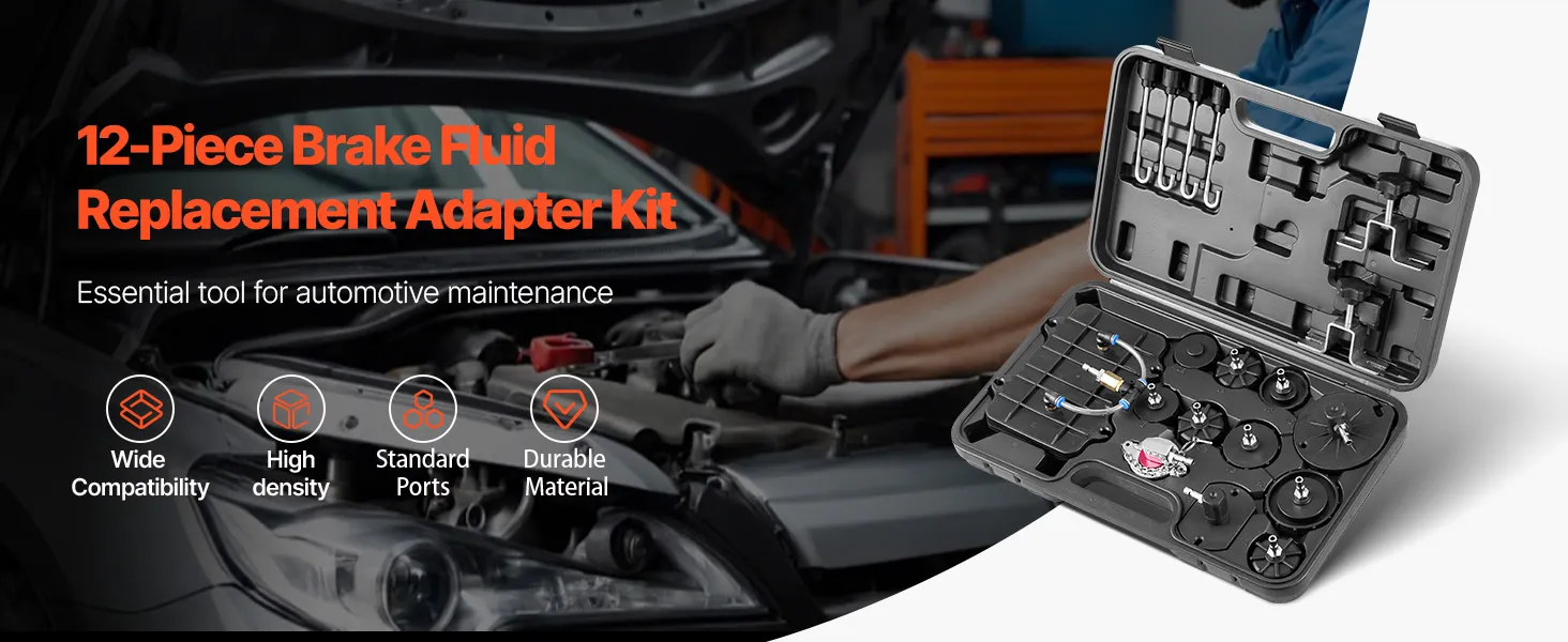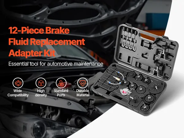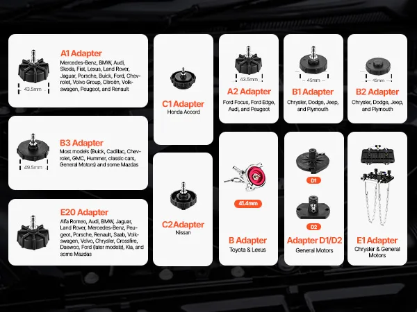 Product Specifications: The 12-piece brake fluid replacement adapter set includes round and rectangular adapters in different sizes. It is compatible with a wide range of vehicles, such as Mercedes-Benz, BMW, Audi, Tesla, Lexus, Land Rover, Jaguar, Porsche, and more.