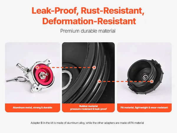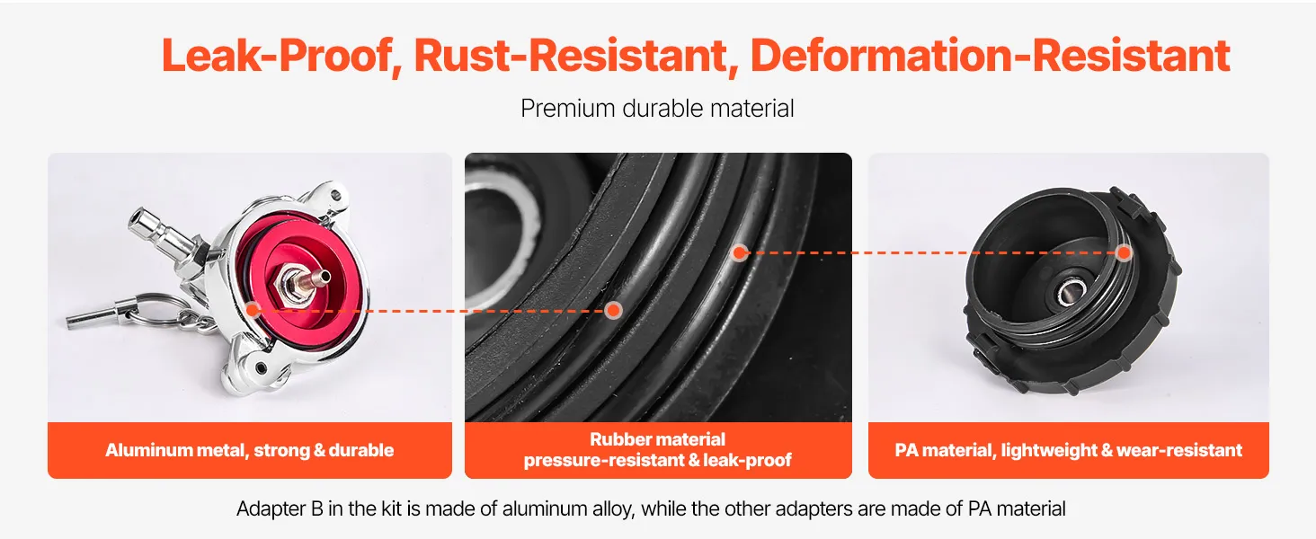 This brake fluid bleeding kit includes 11 round adapters and 1 rectangular adapter, compatible with most European and American vehicles. Made from durable PA+ aluminum alloy, it is corrosion-resistant and avoid leakage. It’s easy to install and store, with a box to keep adapters organized.