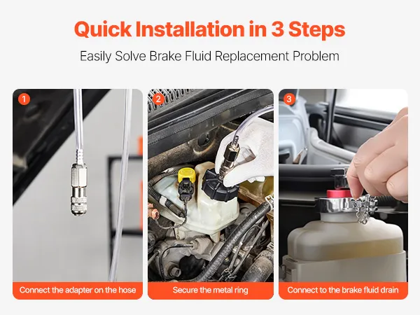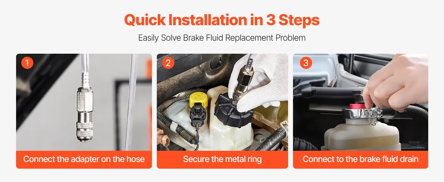 Our product is very easy to install, equipped with standard ports. Simply connect one end to the brake fluid filler hose and the other end to the vehicle's brake fluid master cylinder to assist in brake fluid replacement.