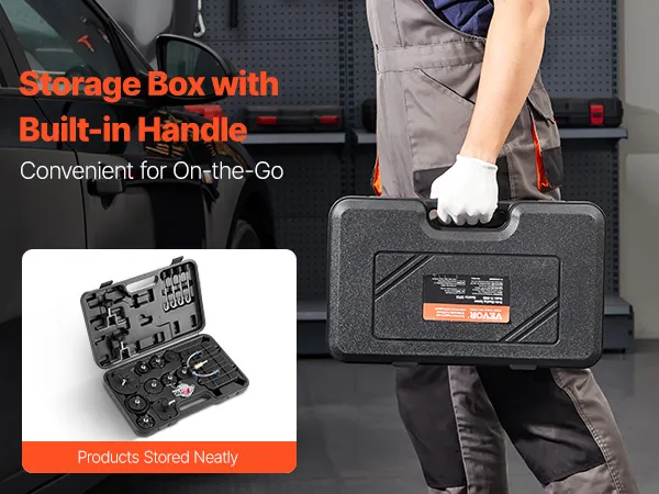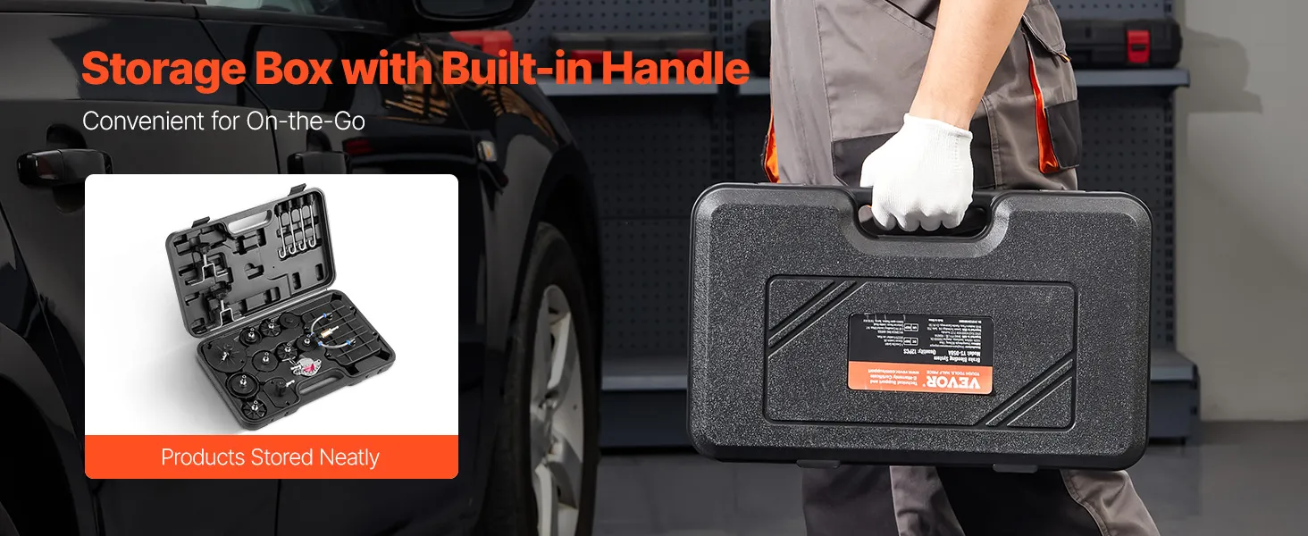 This custom-molded carrying case helps you organize every item in the kit neatly. The master cylinder adapter kit is also guarded from damage or loss during storage. The case features a handle, making it easy to carry and convenient for replacing brake fluid anytime and anywhere.