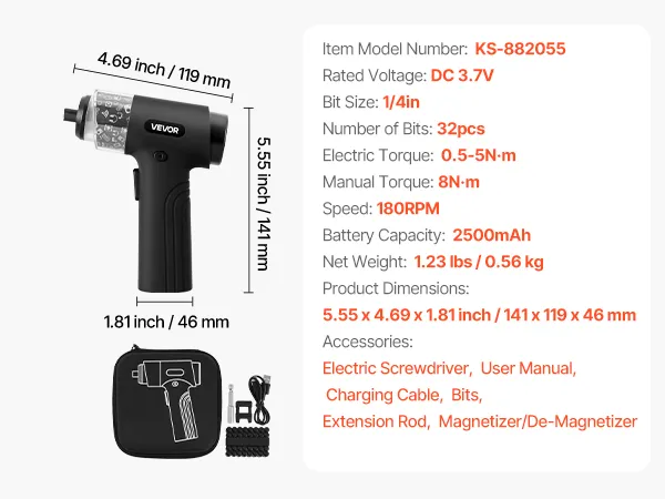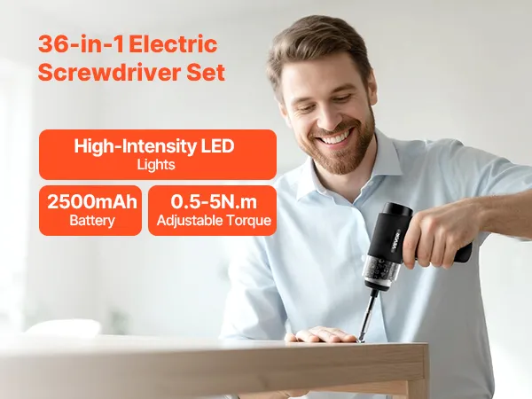 Uitgerust met 32 verwisselbare bits en een instelbaar koppelbereik van 0,5-5 Nm, kan deze elektrische schroevendraaier moeiteloos diverse taken aan. Of u nu aan apparaten, meubels of gadgets werkt, de fijne koppelregeling helpt u schroeven nauwkeurig vast te draaien zonder te overdrijven.
