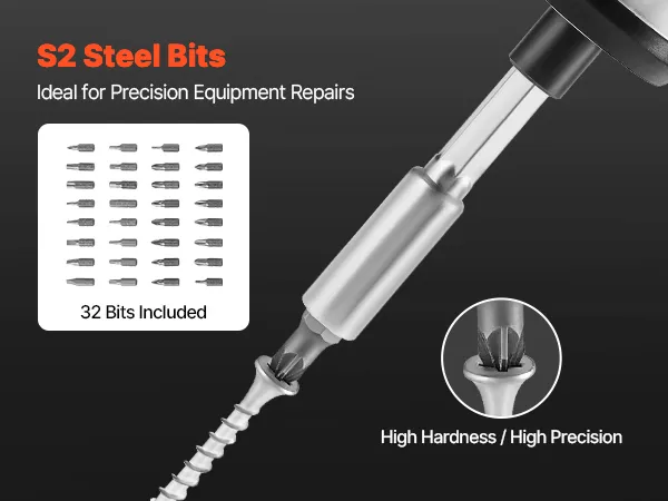 De S2 stalen bits met een hardheid van 58 HRC bieden sterke, stabiele prestaties voor precisiereparaties. Van telefoons en laptops tot elektronische apparaten, deze elektrische schroevendraaierset garandeert nauwkeurig werken met betrouwbare resultaten.