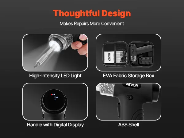 Een EVA-stof etui houdt alle onderdelen georganiseerd en gemakkelijk te vinden, terwijl het digitale display op de handgreep altijd duidelijk de werkstatus weergeeft. De robuuste aluminium behuizing van de elektrische schroevendraaierset is bestand tegen veelvuldig gebruik en garandeert een betrouwbare tool die jarenlang meegaat.