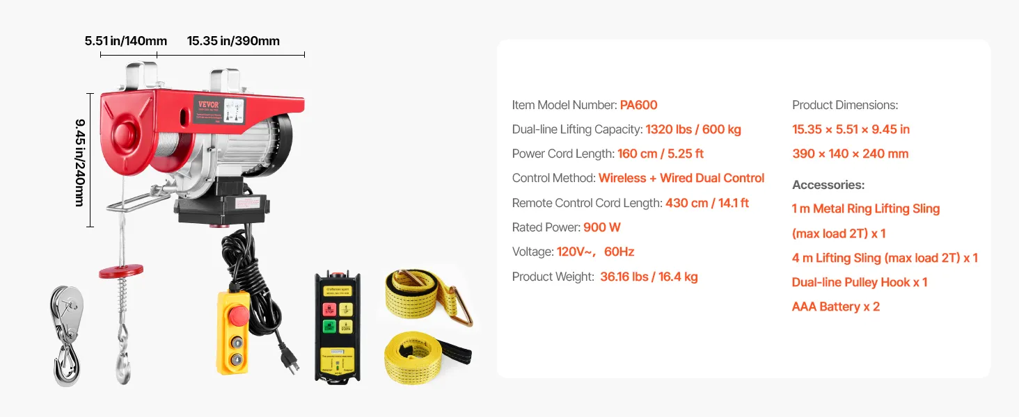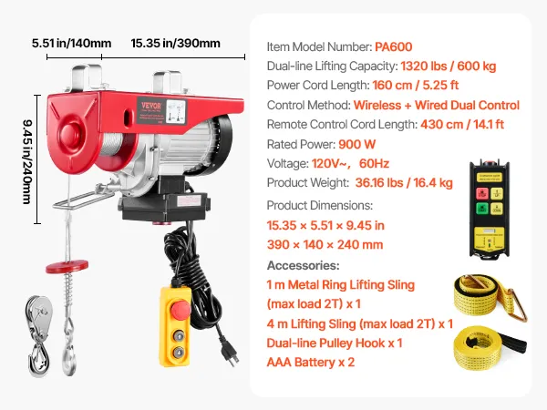 VEVOR Electric Hoist, 1320 lbs 230V Electric Winch with 328 ft Wireless & 14 ft Wired Remote Control, 40 ft Single Cable Lifting Height, Single/Double Slings, Lift Hoist for Garage Warehouse Factory