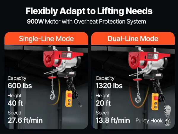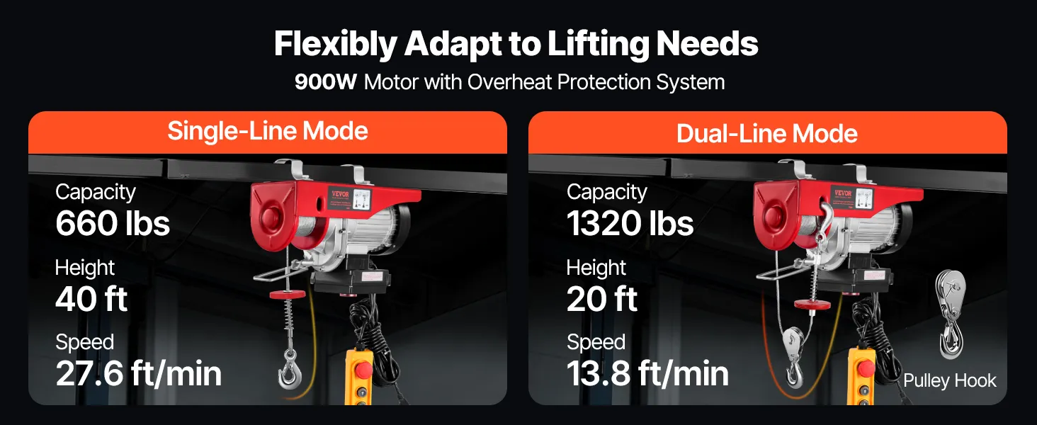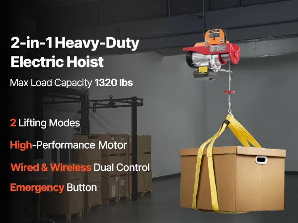 1320 lbs Load Capacity: This electric hoist can easily lift small engines, transmissions, large workshop tools, or construction supplies. Lifting Load Capacity: 660 lbs/300 kg (Single Cable), 1320 lbs/600 kg (Double Cable).