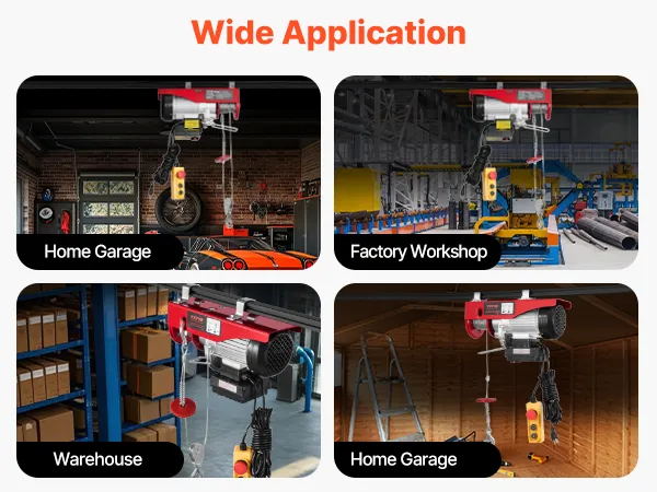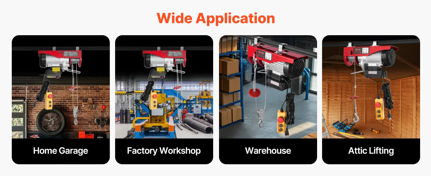 Multiple Uses: This electric cable hoist is widely used in garages, factories, warehouses, and families, as well as professionals and amateurs. It is suitable for repairing ships, cars, lawnmowers, golf carts, home decor, engines, boulders, trees, etc.