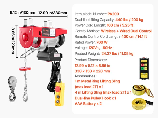 VEVOR elektrische lier, 200 kg, motorlier met 100 m draadloze en 4,2 m bekabelde afstandsbediening, 12 m hefhoogte met enkele kabel, enkele/dubbele hijsbanden, hijsgereedschap voor garage, magazijn, fabriek