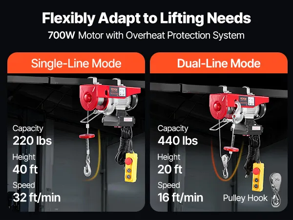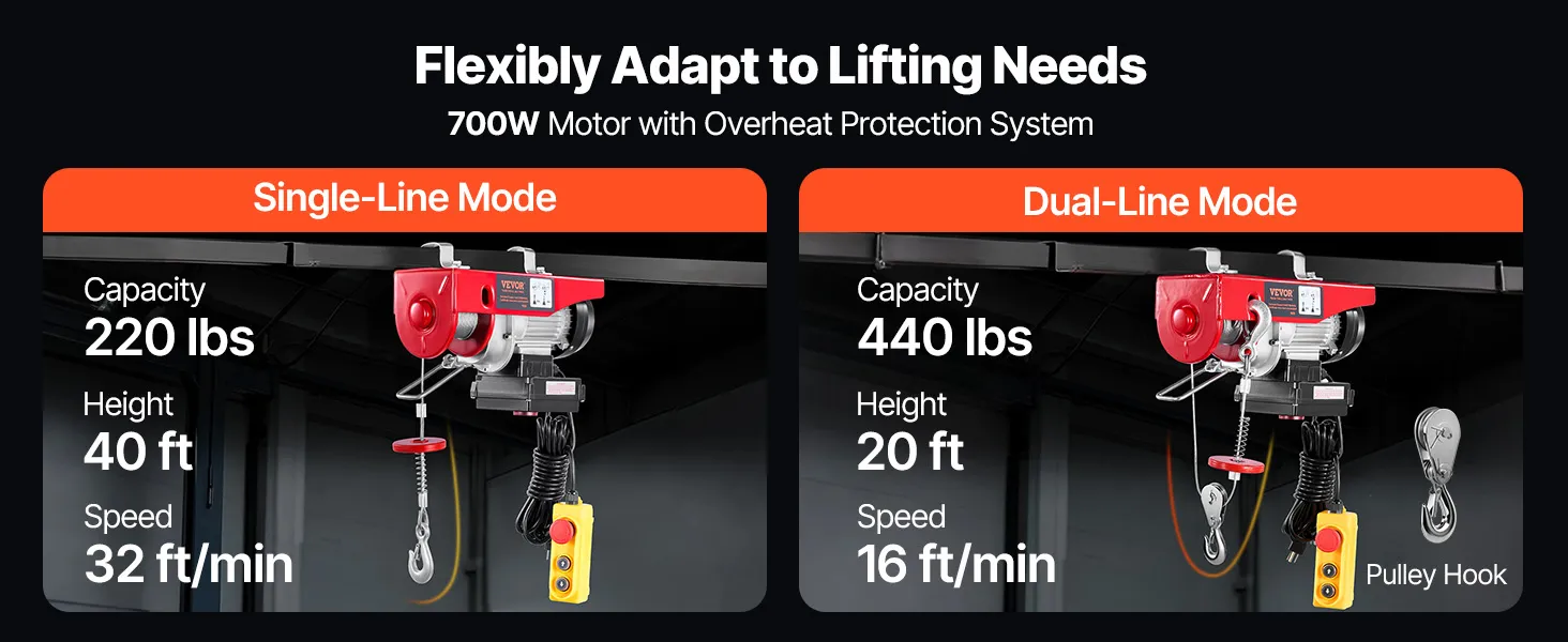 200 kg draagvermogen: deze elektrische takel kan gemakkelijk kleine motoren, tandwielen, groot werkplaatsgereedschap of bouwmaterialen optillen. Laadvermogen: 220 lbs/100 kg (enkele kabel), 440 lbs/200 kg (dubbele kabel).