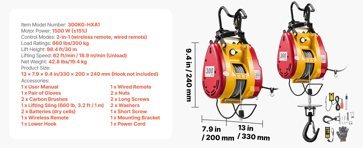VEVOR 2-in-1 Electric Hoist Winch, 300 kg Capacity, 1500W Portable Power Winch Crane, 30 m Lifting Height, 18.9 m/min with Wired and Wireless Remote Control for Factory, Warehouss, Garage
