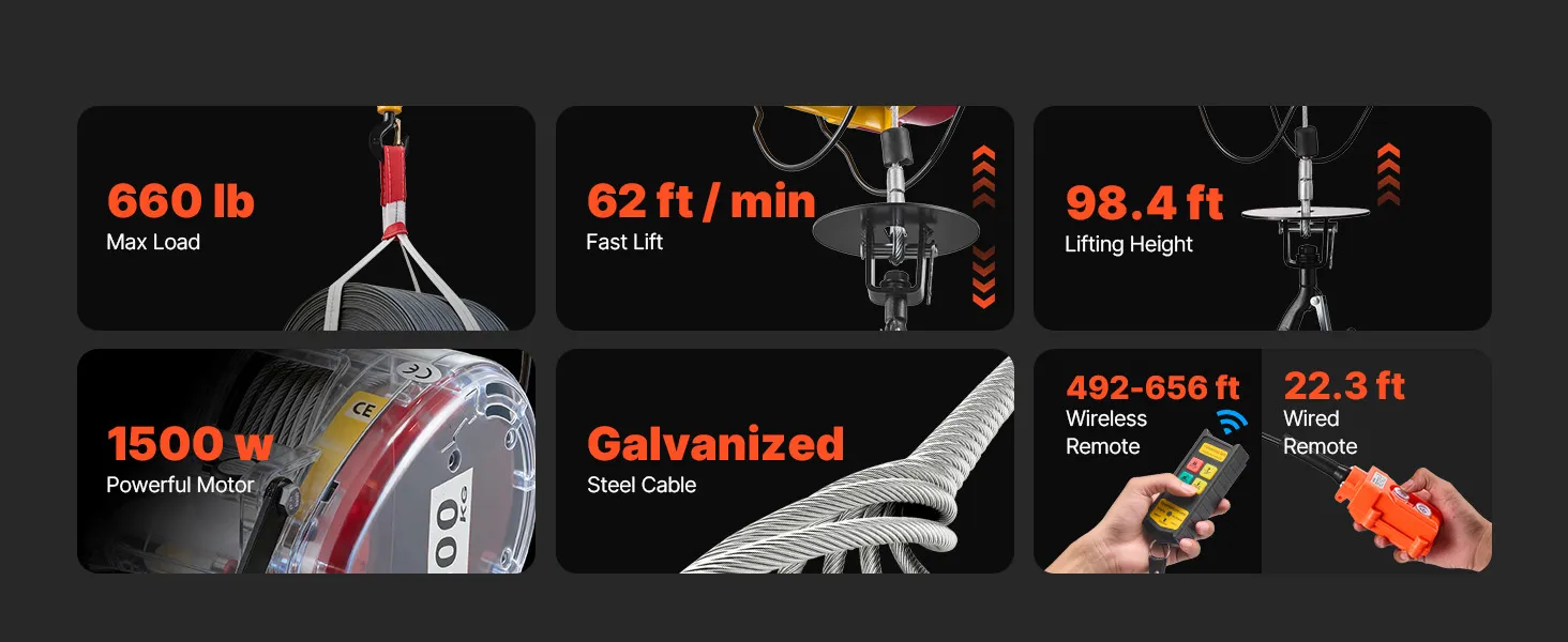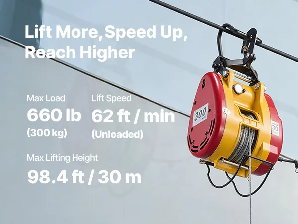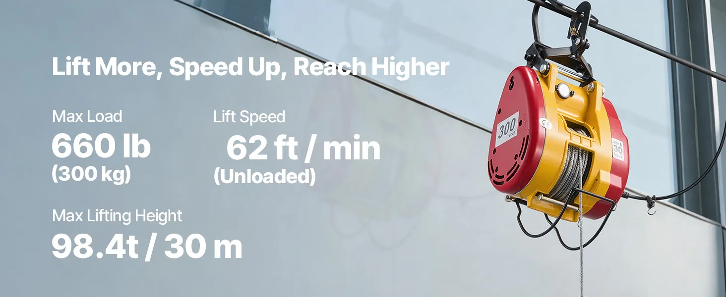 Powerful Lifting Capacity: This portable power winch handles up to 660 lb, lifts at 98.4 ft/min (no load), and reaches 62 ft. It helps you hoist engines, steel, or furniture in garages, warehouses, or balconies