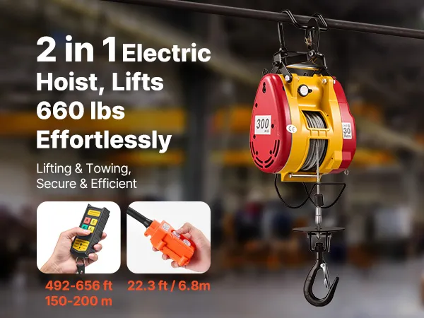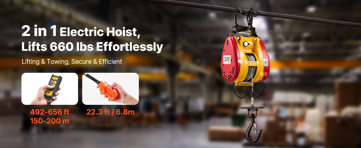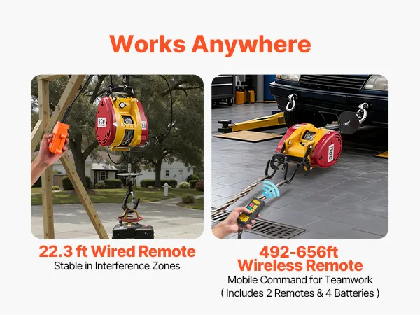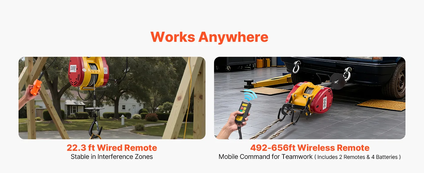 2-in-1 Easy Control: This power electric hoist tackles vertical lifts and horizontal pulls in one unit. The 22.3 ft wired remote delivers precise close control, and the 492-656 ft wireless remote supports mobile teamwork