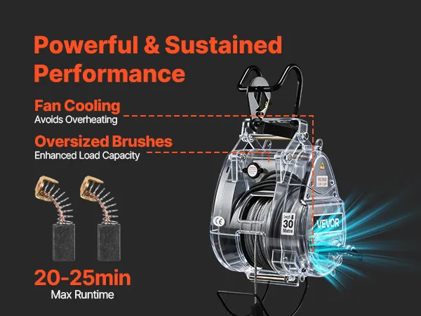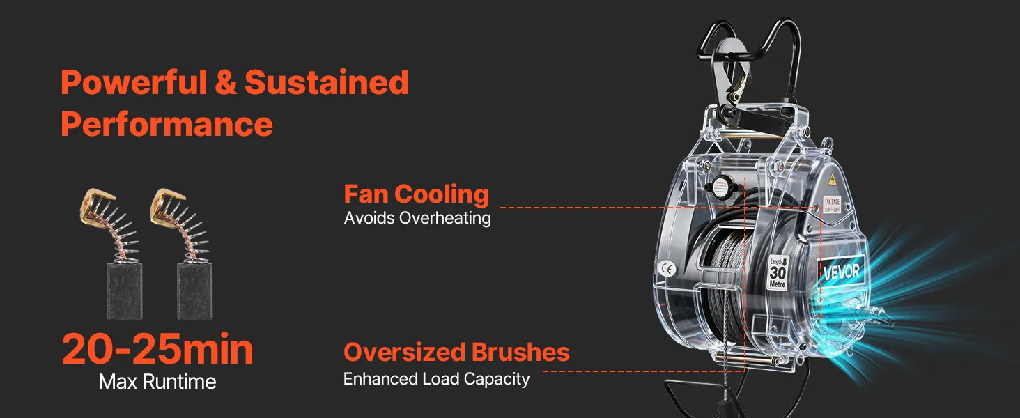 Durable, Reliable Motor: This electric winch crane uses a 1500 W motor with forced-fan cooling and enlarged carbon brushes. The design helps deliver steady output and longer working time for everyday tasks