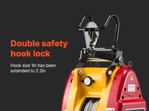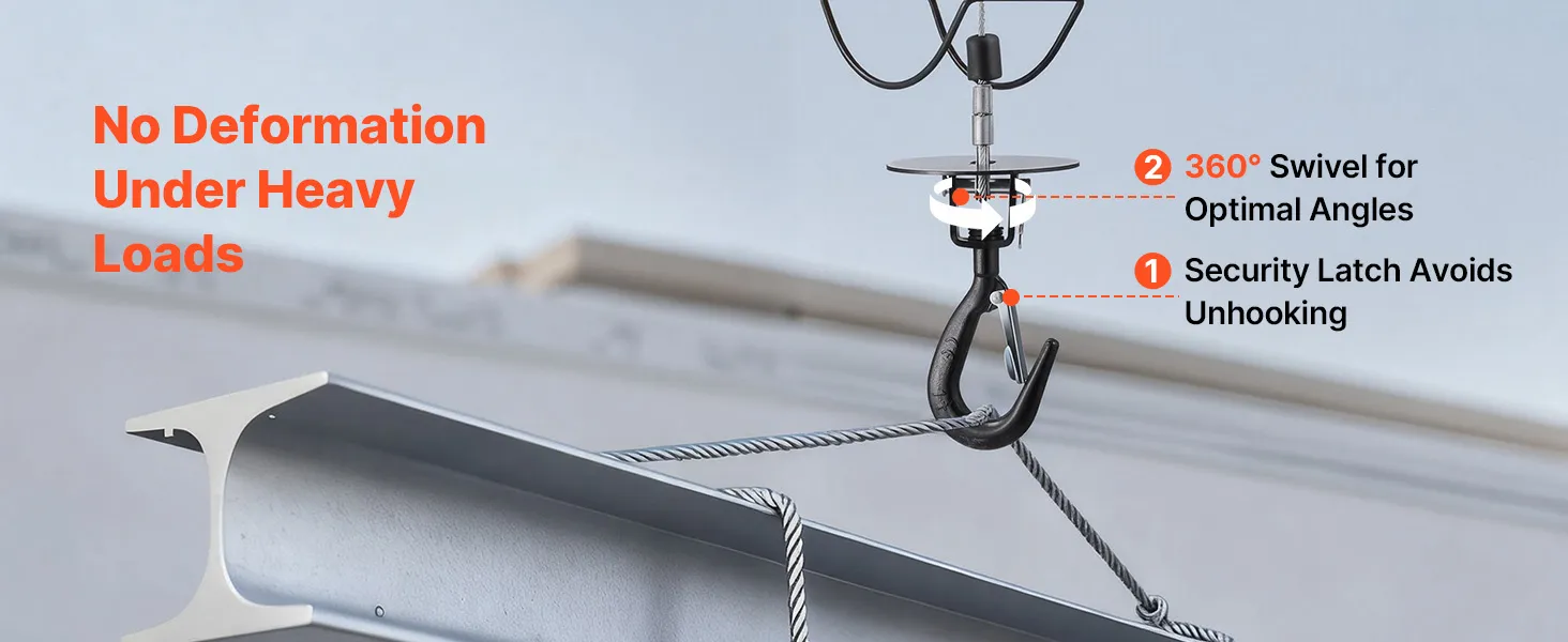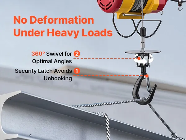 Multi-Layer Security Protection: This electric hoist winch combines electronic and mechanical brakes for confident stopping. A limit switch and 360° latch hook add security, and the motor auto-stops at power loss or top limit to help avoid drops