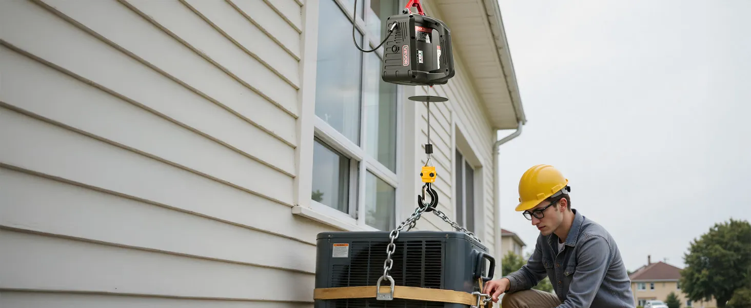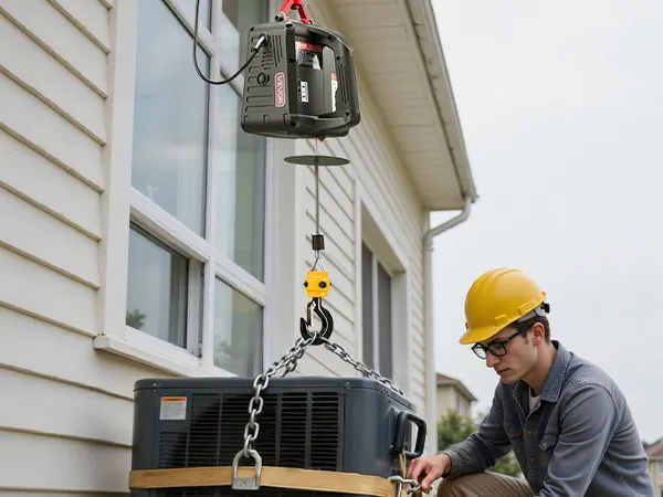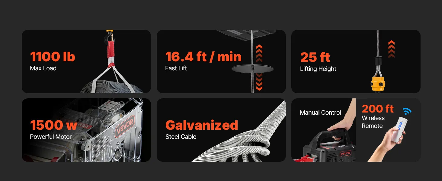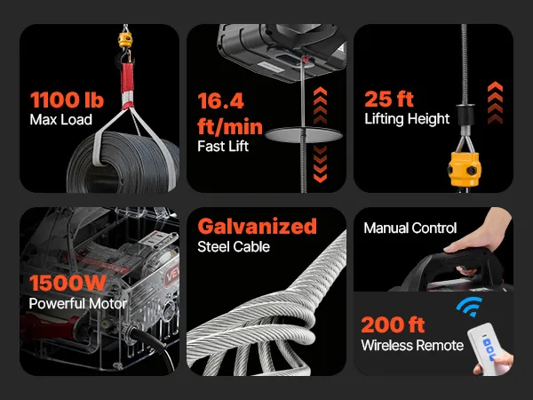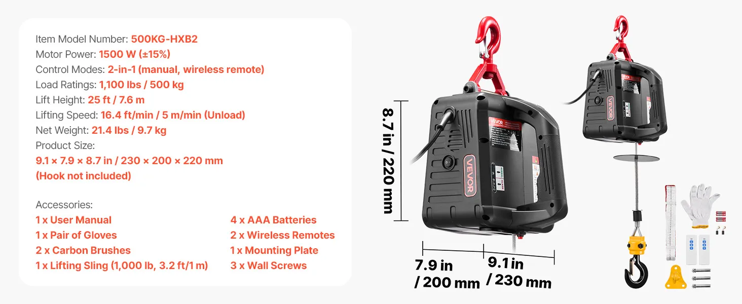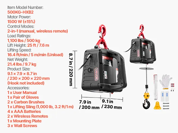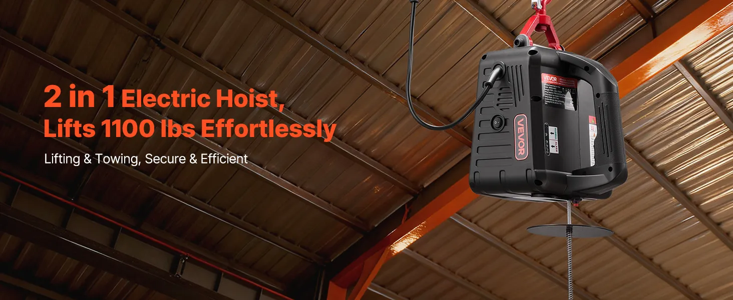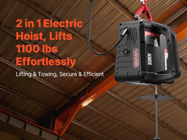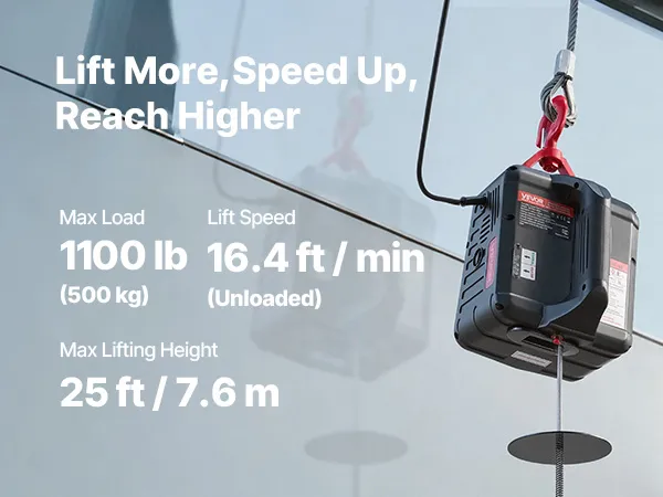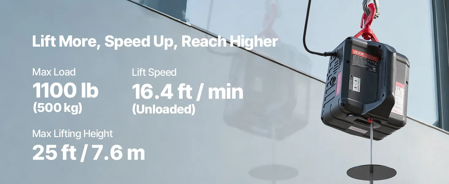 Hoog hefvermogen: Deze draagbare lier kan lasten tot 500 kg tillen, haalt een hefsnelheid van 5 m/min (zonder last) en heeft een bereik van 7,6 m. Hij is ideaal voor het tillen van motoren, stalen constructies of meubels in garages, magazijnen of op balkons.