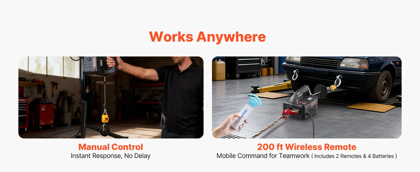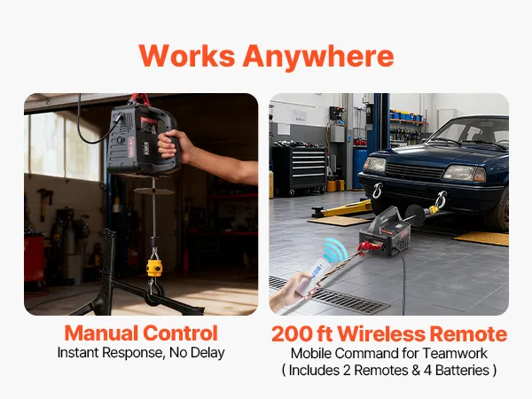 2-in-1 eenvoudige bediening: Deze elektrische takel maakt zowel verticaal heffen als horizontaal trekken mogelijk. De knoppen op de handgreep reageren snel en dankzij het bereik van 60 meter van de draadloze afstandsbediening kan de takel vanaf de grond worden bediend, zelfs op krappe of moeilijk bereikbare plaatsen.