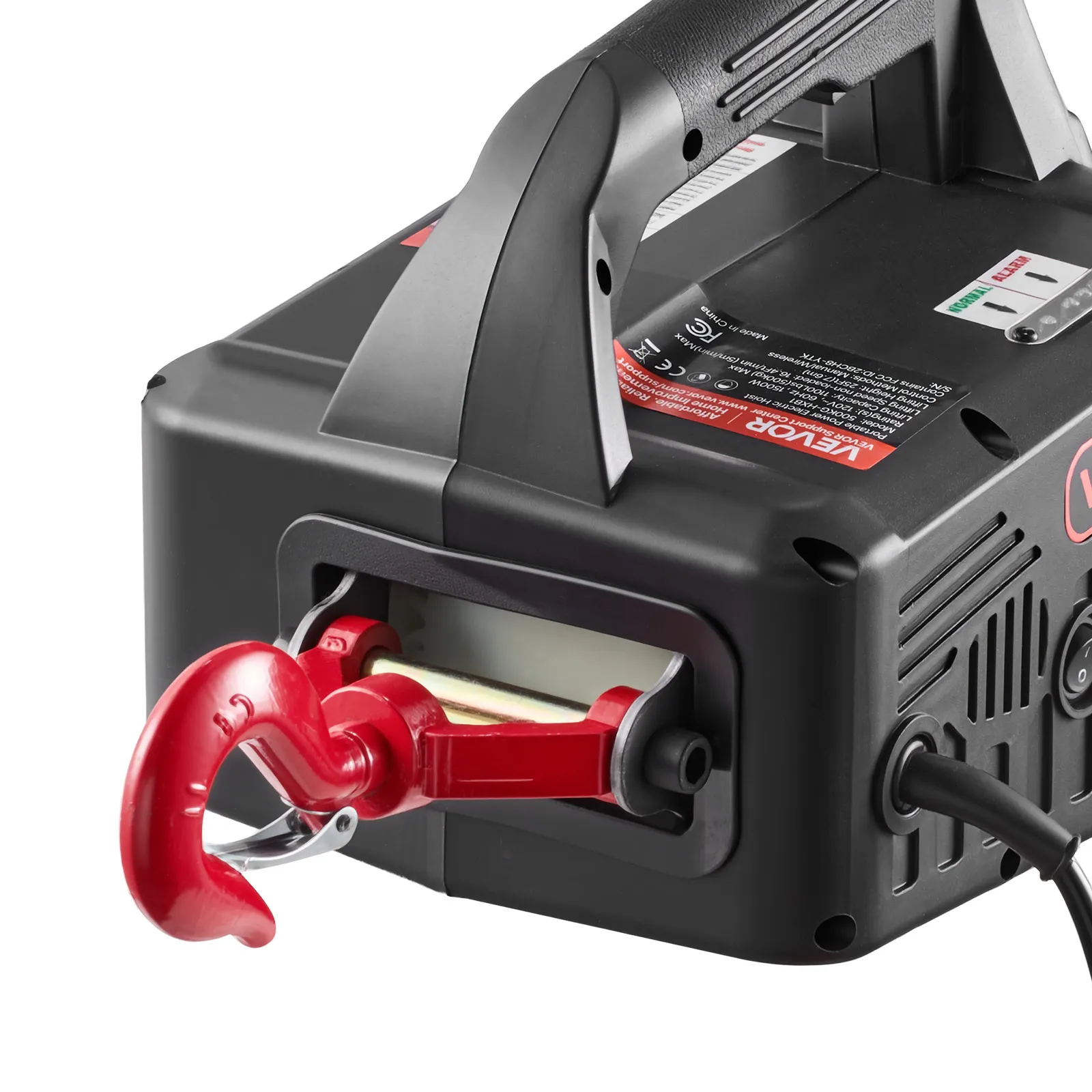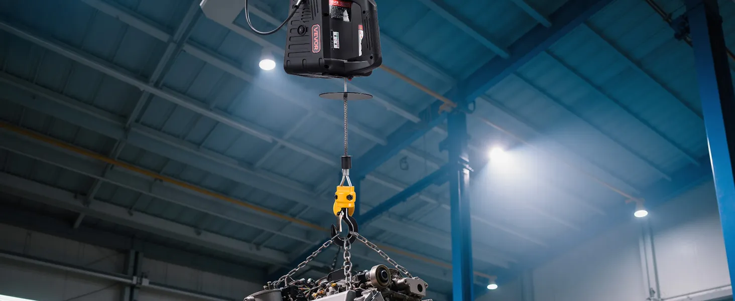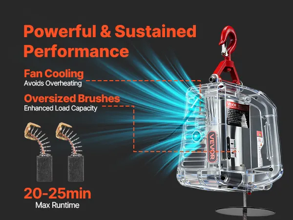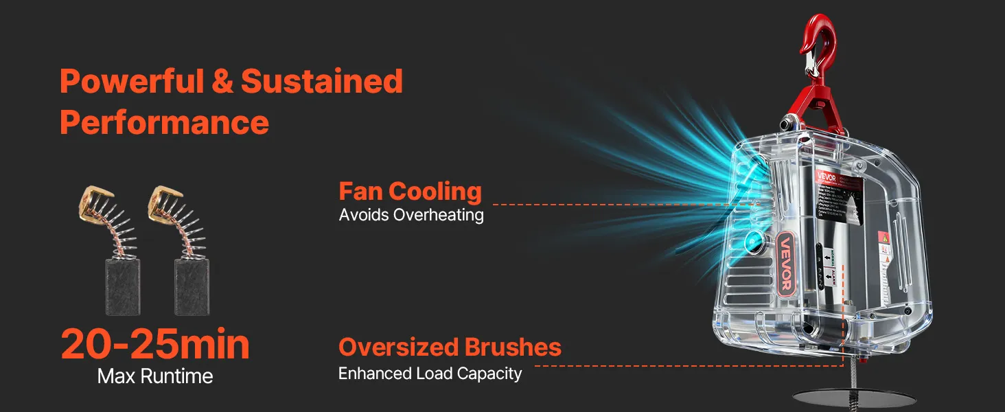 Duurzame, betrouwbare motor: Deze elektrische lierkraan is uitgerust met een 1500W motor met geforceerde luchtkoeling en vergrote koolborstels. Dit ontwerp garandeert constante prestaties en een langere gebruiksduur voor dagelijkse taken.