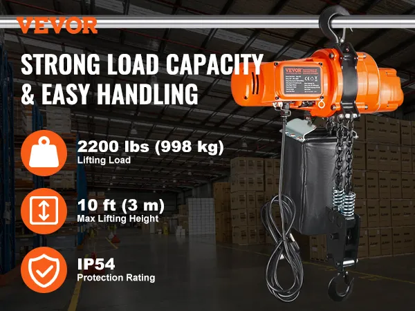 2200 lbs Load Capacity: Say hello to 2200 lbs of lifting power! Our electric chain hoist comes with a top-grade DT carburized chain for durability and strength. Plus, with a 10 ft (3 m) lifting height, it's flexible enough for any space.