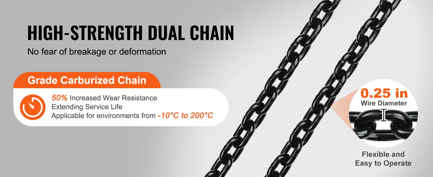 Meet the electric hoist's DT-grade carburized chain that's tough as nails. With over 5% ultimate elongation, it's built to last and won't let you down. No breaking, no bending, just pure lifting power!