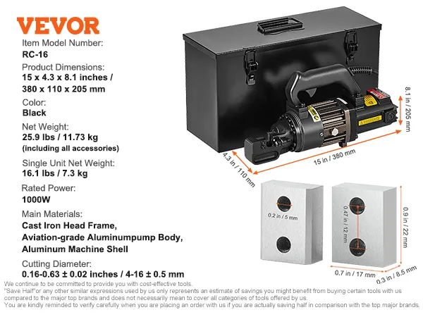 VEVOR elektrische hydraulische boutenschaar, 1000W wapeningsstaalknipper, knipt tot 4-16 mm wapeningsstaal in 2 seconden, wapeningsstaalknipper met oliehoudende accessoires, zwart