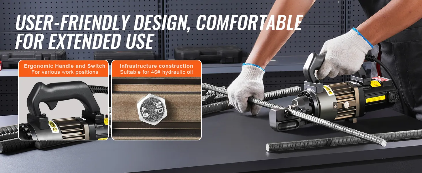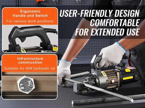 Snel snijden: hydraulische elektrische betonstaalknipper, die massief betonstaal in 2 seconden nauwkeurig kan doorsnijden. Het snijoppervlak is vlak en glad zonder bramen. Krachtige motor van puur koper van 1000 W.