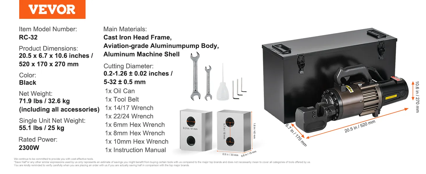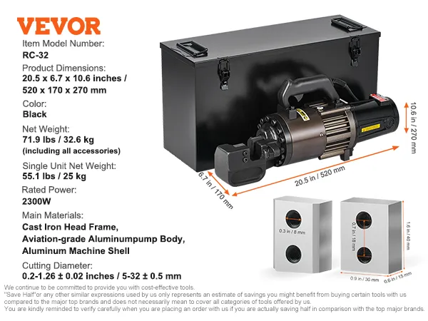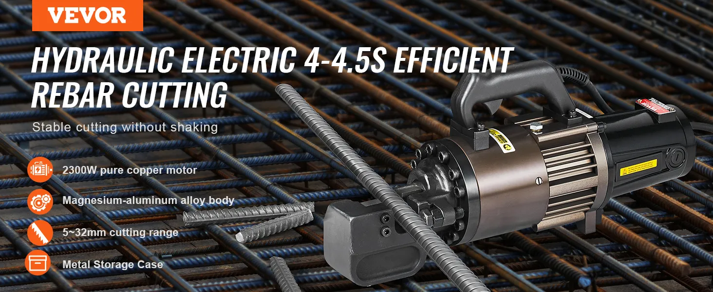 VEVOR Electric Hydraulic Rebar Cutter, 2300W Portable Rebar Cutter, Cutting up to 1.26 Inch (5-32mm) Rebar within 4.5 Seconds, High Power Steel Rebar Cutter with Oil Can Rich Accessories,Black RC-32